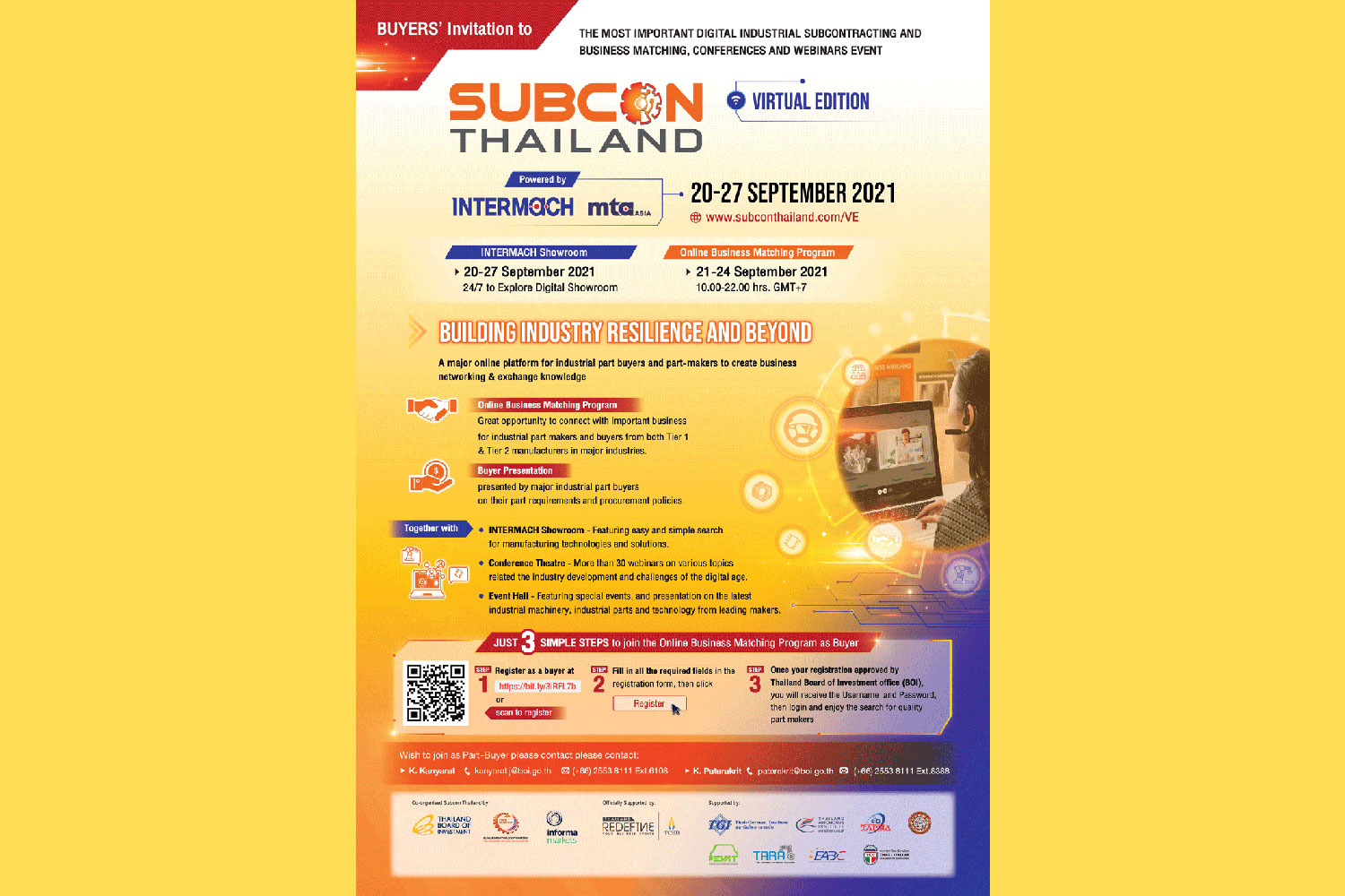 ลงทะเบียนเข้าร่วมเป็นผู้ซื้อชิ้นส่วน: http://subconthailand.com/sct/2021/en/business_matching.asp