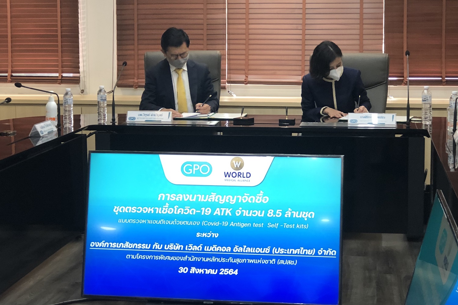 นพ.วิฑูรย์ ด่านวิบูลย์ ผู้อำนวยการองค์การเภสัชกรรม กล่าวว่า วันนี้ (30 สิงหาคม 2564) ได้ลงนามในสัญญากับบริษัท เวิลด์ เมดิคอล อัลไลแอนซ์ ประเทศไทย จำกัด เพื่อจัดซื้อ ATK จำนวน 8.5 ล้านชุด ให้สำนักงานหลักประกันสุขภาพแห่งชาติ ( สปสช. ) และโรงพยาบาลราชวิถี หลังจากเมื่อวันที่ 26 สิงหาคม 2564 ที่คณะอนุกรรมการจัดทำแผนการจัดซื้อยา เวชภัณฑ์ และอุปกรณ์ทางการแพทย์ที่จำเป็นตามโครงการพิเศษของ สปสช. ที่ได้เห็นชอบราคาชุดตรวจ ATK ตามที่องค์การฯเสนอ และให้โรงพยาบาลราชวิถีดำเนินการจัดซื้อจากองค์การฯต่อไป ซึ่งภายใน 14 วันหลังจากลงนามสัญญา บริษัทจะนำเข้า ATK มาและจัดส่งให้หน่วยบริการจำนวน 1,000 แห่ง ตามที่ สปสช. กำหนด ซึ่งขณะนี้อยู่ระหว่างที่ สปสช.กำหนดสถานที่จัดส่งที่ชัดเจนอยู่ คาดว่าจะสามารถเริ่มกระจายได้ในช่วงวันที่ 8 หรือ 9 กันยายนนี้