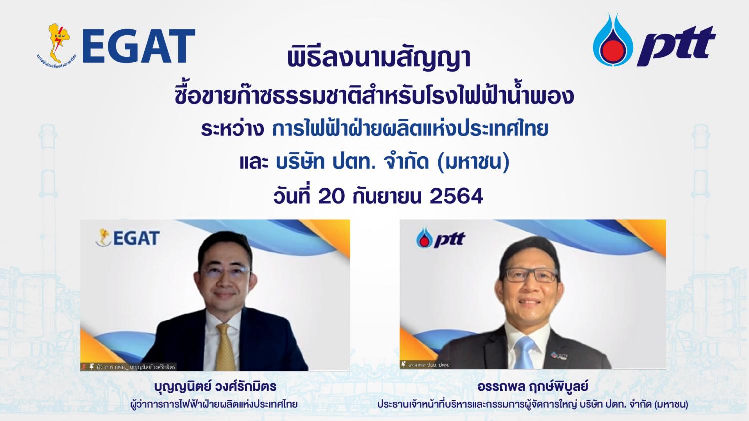 นายอรรถพล ฤกษ์พิบูลย์ ประธานเจ้าหน้าที่บริหารและกรรมการผู้จัดการใหญ่ บริษัท ปตท. จำกัด (มหาชน) (ปตท.) และ นายบุญญนิตย์ วงศ์รักมิตร ผู้ว่าการการไฟฟ้าฝ่ายผลิตแห่งประเทศไทย (กฟผ.) ร่วมลงนามสัญญาซื้อขายก๊าซธรรมชาติสำหรับโรงไฟฟ้าน้ำพองฉบับใหม่ ระยะเวลา 10 ปี (2564 – 2574) มูลค่ากว่า 53,000 ล้านบาท เสริมสร้างความมั่นคงทางพลังงาน เพิ่มขีดความสามารถการพัฒนาภาคตะวันออกเฉียงเหนือ พร้อมรองรับการขยายตัวทางเศรษฐกิจของประเทศ
