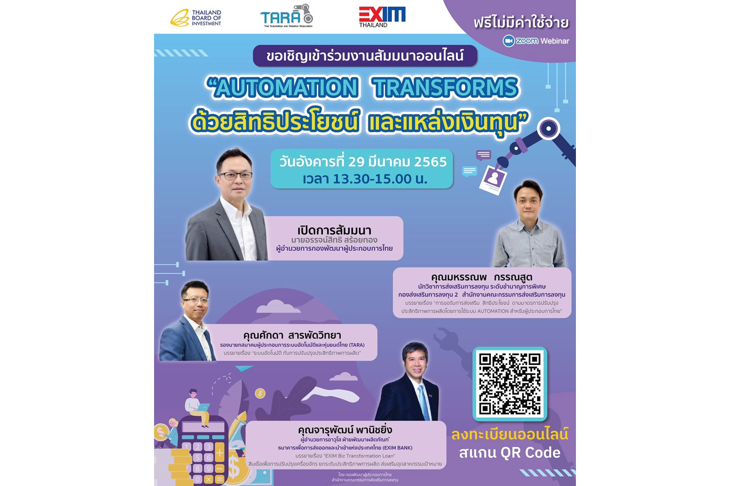 บีโอไอเชิญฟังสัมมนาออนไลน์ “AUTOMATION TRANSFORMS ด้วยสิทธิประโยชน์ และแหล่งเงินทุน”