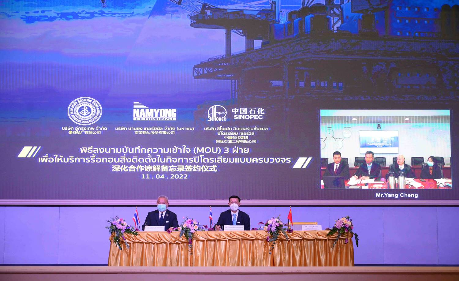 มร.หยาง เฉิง รองผู้จัดการทั่วไป บริษัท ซิโนเปค อินเตอร์เนชั่นแนล ปิโตรเลียม เซอร์วิส คอร์ปอเรชั่น เปิดเผยหลังร่วมลงนาม MOU จัดตั้งกิจการร่วมค้าในประเทศไทยระหว่าง บริษัท อู่กรุงเทพ จำกัด และบริษัท นามยง เทอร์มินัล จำกัด (มหาชน) ว่าการลงนามครั้งนี้เพื่อร่วมกันดำเนินธุรกิจรื้อถอนแท่นปิโตรเลียมมาตรฐานสากลในอ่าวไทยแบบครบวงจร (One-Stop Service) รายแรกในประเทศไทย รองรับความต้องการรื้อถอนแท่นปิโตรเลียมที่จะทยอยหมดอายุสัมปทานตั้งแต่ปี 2565 ต่อเนื่องไปอีก 20 ปีข้างหน้า