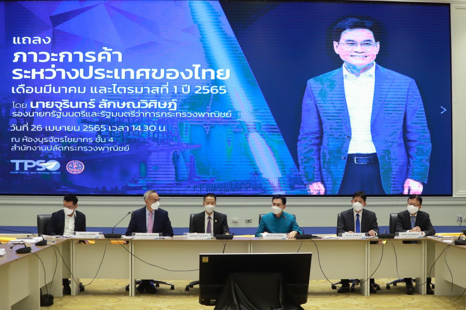 เมื่อวันที่ 26 เมษายน นายจุรินทร์ ลักษณวิศิษฏ์ รองนายกรัฐมนตรีและรมว.พาณิชย์ พร้อมด้วย นายบุณยฤทธิ์ กัลยาณมิตร ปลัดกระทรวงพาณิชย์ นายรณรงค์ พูลพิพัฒน์ ผู้อำนวยการสำนักงานนโยบายและยุทธศาสตร์การค้า นายภูสิต รัตนกุล เสรีเริงฤทธิ์ อธิบดีกรมส่งเสริมการค้าระหว่างประเทศ นายพิทักษ์ อุดมวิชัยวัฒน์ อธิบดีกรมการค้าต่างประเทศ และนายวัฒนศักย์ เสือเอี่ยม อธิบดีกรมการค้าภายใน แถลงภาวะการค้าระหว่างประเทศเดือนมีนาคม 2565 และไตรมาสแรกของปี 2565 ณ กระทรวงพาณิชย์