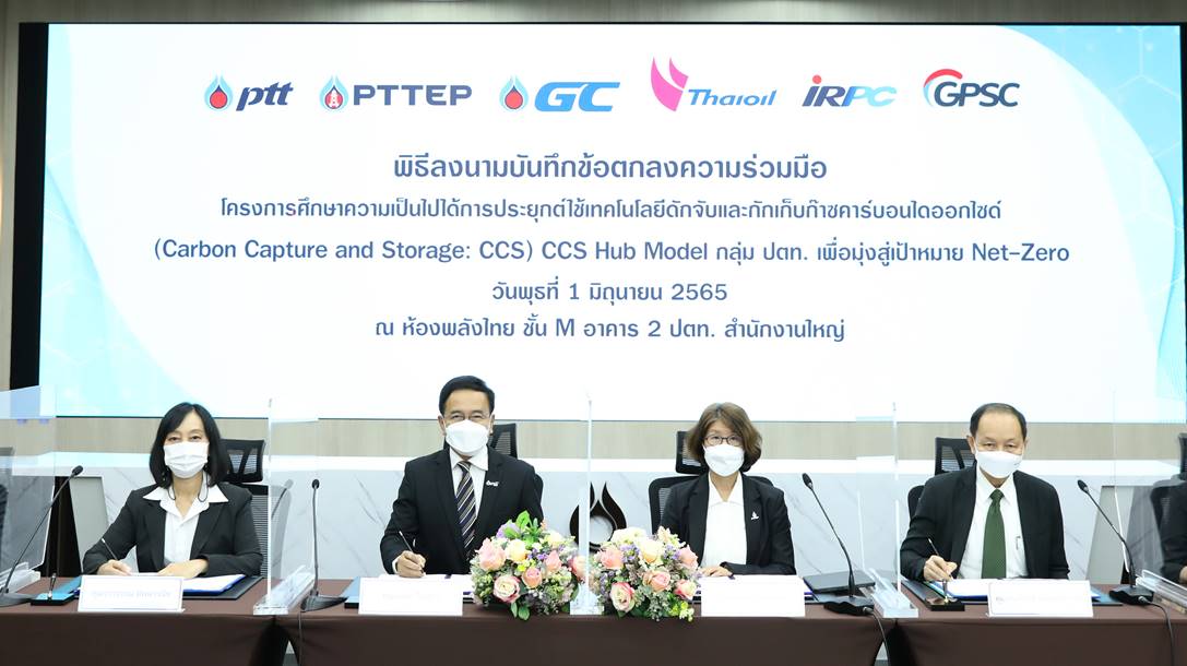 ทั้งนี้จะนำร่องศึกษาแนวทางการประยุกต์ใช้เทคโนโลยีการดักจับและกักเก็บก๊าซคาร์บอนไดออกไซด์ (Carbon Capture and Storage: CCS) ในรูปแบบ CCS Hub Model ซึ่ง CCS เป็นเทคโนโลยีที่มีศักยภาพในการกักเก็บ CO2 จากกระบวนการผลิตได้ในระดับหลายล้านตันต่อปี และนำไปกักเก็บในชั้นธรณีที่มีศักยภาพและเหมาะสมแบบปลอดภัยและถาวร (Permanent Geological Storage) โดยไม่มีการปล่อยกลับเข้าสู่ชั้นบรรยากาศได้อีก ซึ่งจะเริ่มศึกษาในพื้นที่ปฏิบัติการกลุ่ม ปตท. จังหวัดระยองและชลบุรี ความร่วมมือนี้นับเป็นต้นแบบสำคัญในการขยายผลสู่ระดับประเทศได้ในอนาคตเพื่อช่วยขับเคลื่อนองค์กรและประเทศไทยให้บรรลุเป้าหมาย Carbon Neutrality และ Net Zero อย่างเป็นรูปธรรม ยกระดับการพัฒนาประเทศสู่ความยั่งยืนได้ต่อไป