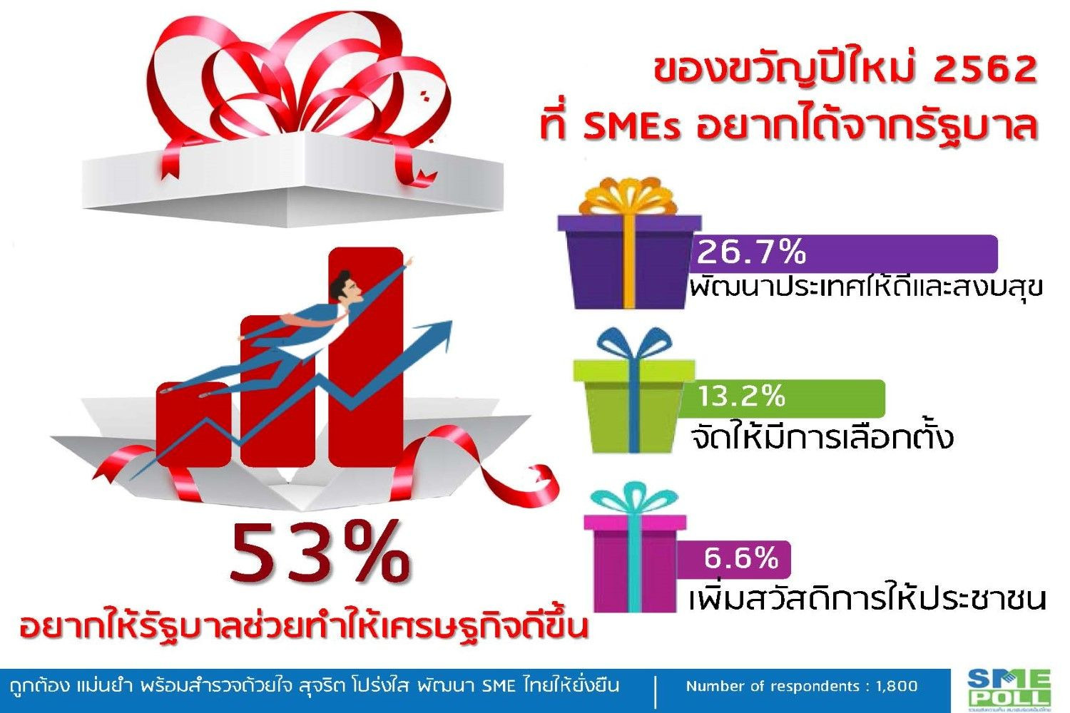 เมื่อวันที่ 11 ก.พ. 62 ศูนย์วิจัยธุรกิจและเพิ่มศักยภาพผู้ประกอบการ สมาพันธ์เอสเอ็มอีไทย (SME Poll) เปิดเผยสำรวจความคิดเห็นของผู้ประกอบการวิสาหกิจขนาดกลางและขนาดย่อม (SMEs) จำนวน 1,800 วิสาหกิจทั่วประเทศ ในหัวข้อเรื่อง "ของขวัญปีใหม่ 2562 ที่ SMEs อยากได้จากรัฐบาล" พบว่า ของขวัญปีใหม่ที่ SMEs อยากได้จากรัฐบาลมากที่สุด ร้อยละ 53.56 ได้แก่ “อยากให้รัฐบาลช่วยทำให้เศรษฐกิจดีขึ้น” รองลงมา ร้อยละ 26.67 อยากให้รัฐบาลพัฒนาประเทศให้ดีขึ้นและสงบสุข ร้อยละ 13.22 อยากให้จัดให้มีการเลือกตั้งเร็วๆ และร้อยละ 6.56 อยากให้รัฐบาลช่วยเพิ่มสวัสดิการให้แก่ประชาชน