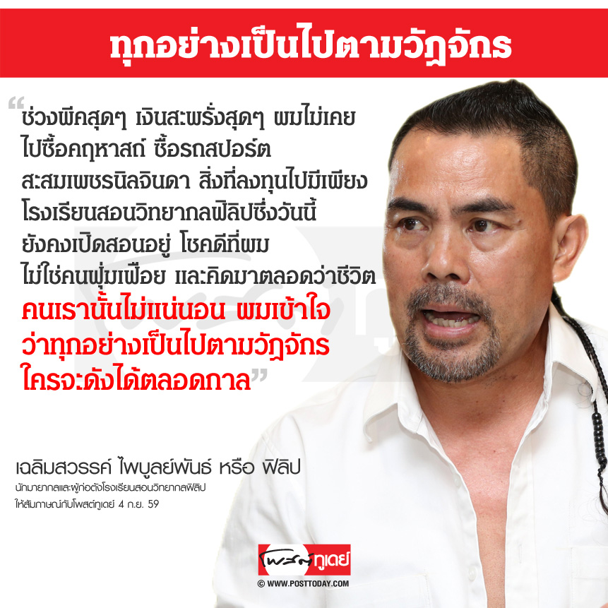 ช่วงพีคสุดๆ เงินสะพรั่งสุดๆ ผมไม่เคยไปซื้อคฤหาสถ์ ซื้อรถสปอร์ต สะสมเพชรนิลจินดา สิ่งที่ลงทุนไปมีเพียงโรงเรียนสอนวิทยากลฟิลิปซึ่งวันนี้ยังคงเปิดสอนอยู่ โชคดีที่ผมไม่ใช่คนฟุ่มเฟือย และคิดมาตลอดว่าชีวิตคนเรานั้นไม่แน่นอน ผมเข้าใจว่าทุกอย่างเป็นไปตามวัฎจักร ใครจะดังได้ตลอดกาล พอกระแสเริ่มแผ่ว ผมเริ่มหายหน้าไปจากสื่อ แต่งานยังคงมีตลอด คำว่าขาลงไม่ใช่เรื่องฝีมือตกเหมือนนักร้อง ถ้าเขาร้องเพลงเก่ง ร้องเพลงเพราะ คุณภาพเขาไม่มีวันตกอยู่แล้ว มันขึ้นอยู่กับความต้องการของตลาดต่างหาก สมัยก่อนฟิลิปออกทุกรายการ คนก็เบื่อ ถึงวันหนึ่้งเขาก็ไปสนใจอย่างอื่น