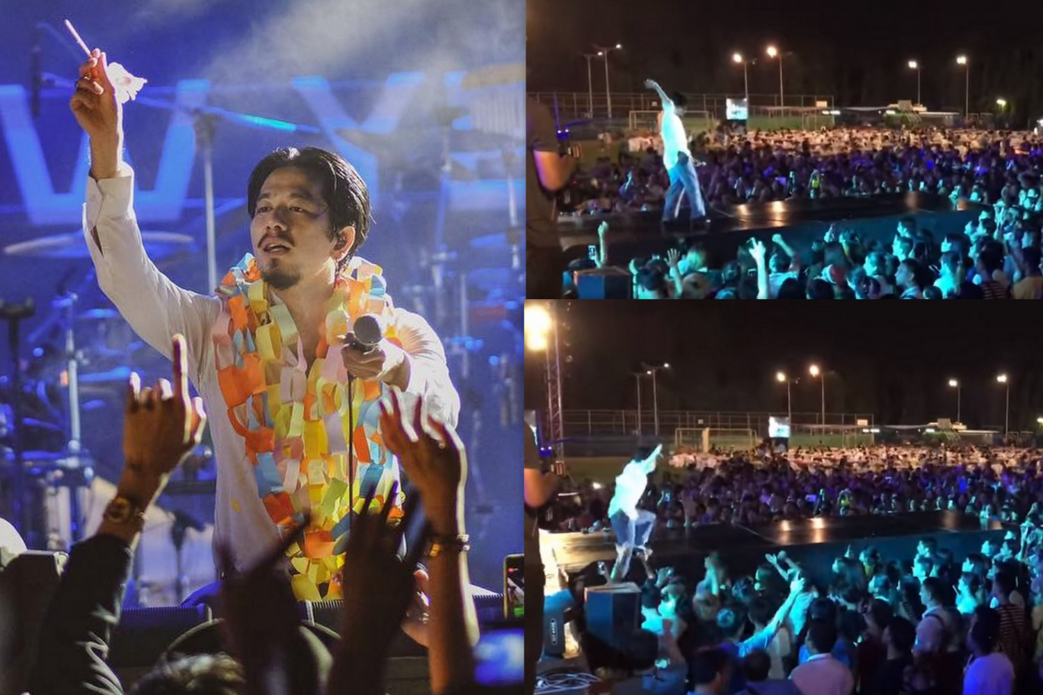 งานนี้เพื่อนในวงรีบชะโงกตัวดูว่า หนุ่มแหลม เป็นอะไรมากมั้ย สักพักเจ้าตัวก็ลุกขึ้นบอก ไอเลิฟยู และร้องเพลงต่อพร้อมกับชูมือขึ้นถามแฟน ๆ ว่าใครเห็นมือผมบ้าง ยืนยันว่ายังอยู่ดีมีสปิริตร้องเล่นต่อจนจบ ผ่านค่ำคืนนี้ไปได้อย่างฉิวเฉียด แถมเพจหลักของวงยังนำคลิปมาลงตอกย้ำความบันเทิงให้คนเข้ามากดไลค์คอมเมนต์กันเพียบ