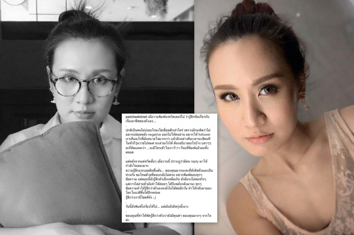 "เมื่อวานพิมพ์ลงทวิตเตอร์ไป ว่ารู้สึกท้อเกี่ยวกับเรื่องอาชีพของตัวเอง... ปกติเป็นคนไม่บ่นอะไรลงโซเชี่ยลซักเท่าไหร่ เพราะมักจะคิดว่าไม่อยากปล่อยพลัง negative ออกไปให้คนอ่าน อยากให้ follower เราเห็นอะไรที่มันสบายใจมากกว่า