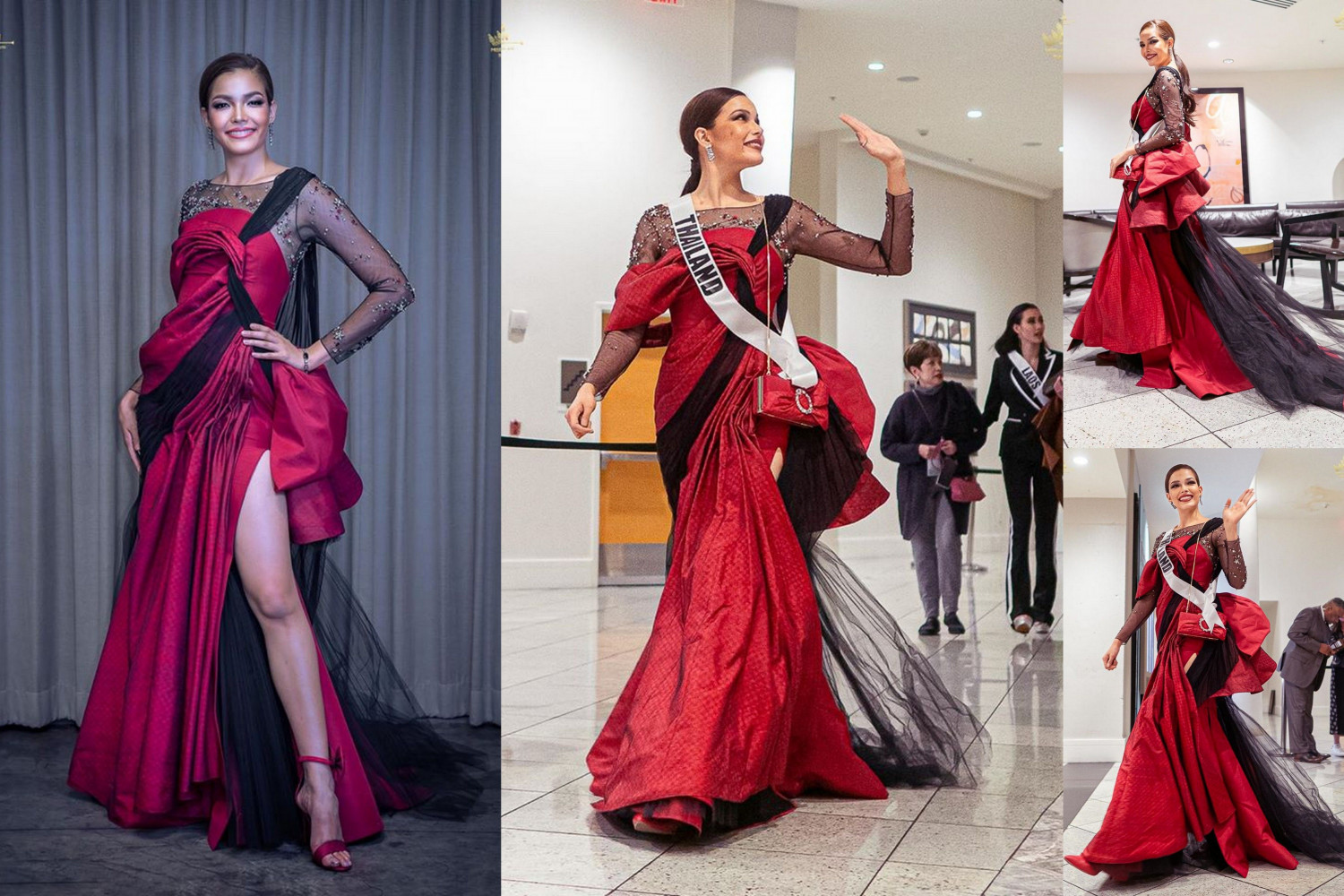 สวยให้สุดหยุดที่จักรวาล! ฟ้าใส ปวีณสุดา ในชุดราตรีผ้าไหมสีแดงสุดหรูจากแบรนด์ sirivannavari
