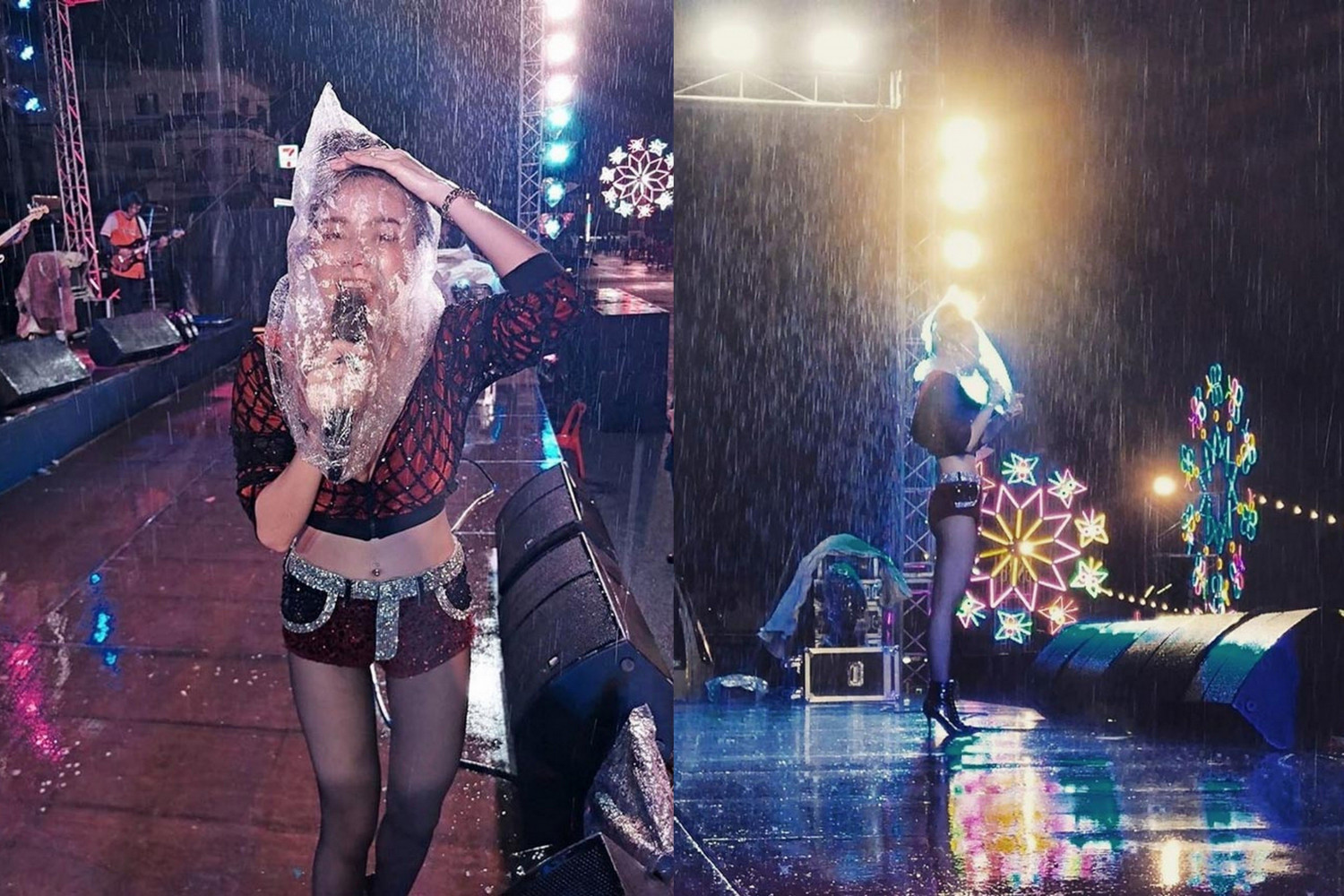 ล่าสุด สาวจ๊ะ เต็มที่กับโชว์มากถึงแม้ฝนจะตกแต่ก็ไม่ยอมหลบ ร้องต่อด้วยการนำถุงพลาสติกไว้ที่ศีรษะเพื่อกันน้ำฝนเพราะแฟนๆมารอแล้วก็ต้องโชว์สปิริตสักหน่อย โดยเธอโพสต์ภาพพร้อมแคปชั่นติดตลกไว้ว่า...