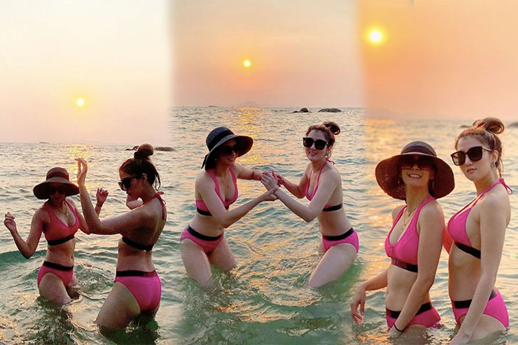 "เอมี่-เธอ" พากันใส่ชุดบิกินี่สีสดเต้นกลางทะเล รับพระอาทิตย์ตกดิน