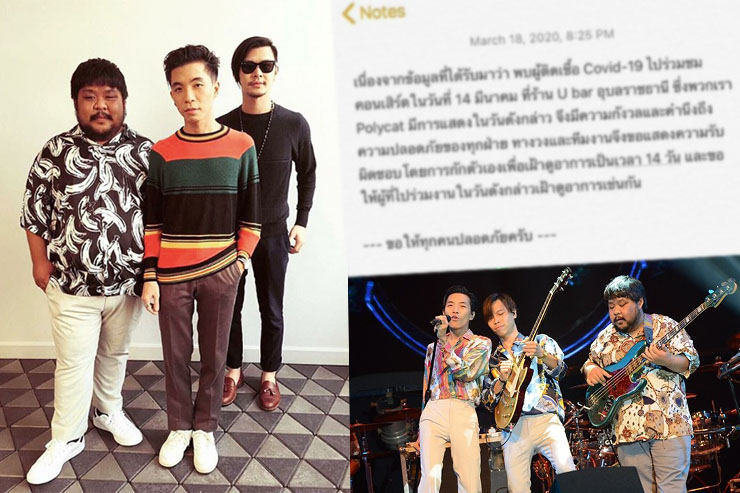 หลังจากได้เดินทางไปเล่นดนตรีที่จังหวัดอุบลราชธานีเมื่อวันที่ 14 มีนาคม 2563 สำหรับศิลปินวงดัง POLYCAT ที่ได้ออกมาเผยว่าทางวงและทีมงานที่ได้เดินทางไปจังหวัดอุบลราชธานีจะขอกักตัว 14 วัน หลังจากได้พบว่ามีลูกค้าที่มาร้านในวันนั้นเป็นผู้ติดเชื้อ ไวรัสโคโรน่า หรือ โควิด-19