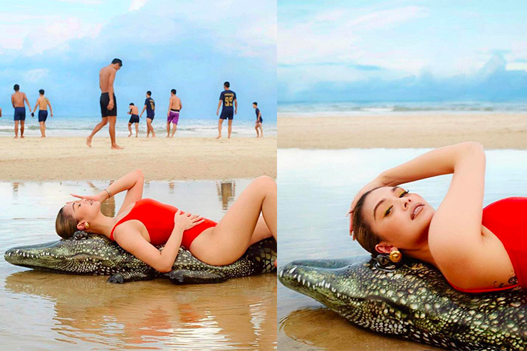 แน่นอนว่าในเรื่องของแฟชั่น ความเผ็ด ความแซ่บ เธอนั้นไม่เคยยอมใคร เรียกว่าขนชุดว่ายน้ำไปวันต่อวันเลยทีเดียว แถมล่าสุดเธอนั้นได้โชว์ความแซ่บด่วยการนอนริมชายหาดบนแพรูปจระเข้ ท่ามกลางกลุ่มหนุ่มๆ ที่อยู่ด้านหลังเป็นจำนวนมาก