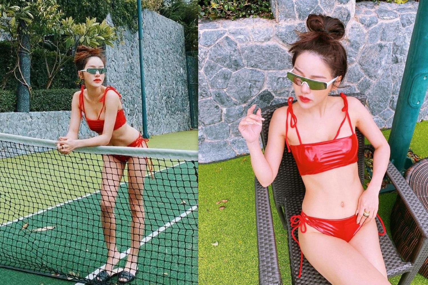 แต่ที่เด็ดสุดเห็นจะเป็นชุดบิกินี่ลาเท็กซ์สีแดงเพลิง ถ่ายภาพอวดความแซ่บเอวเอสอยู่ในสนามเทนนิส และมุมบันไดโชว์บันท้ายเด้งๆ พร้อมแคปชั่นไว้ว่า...