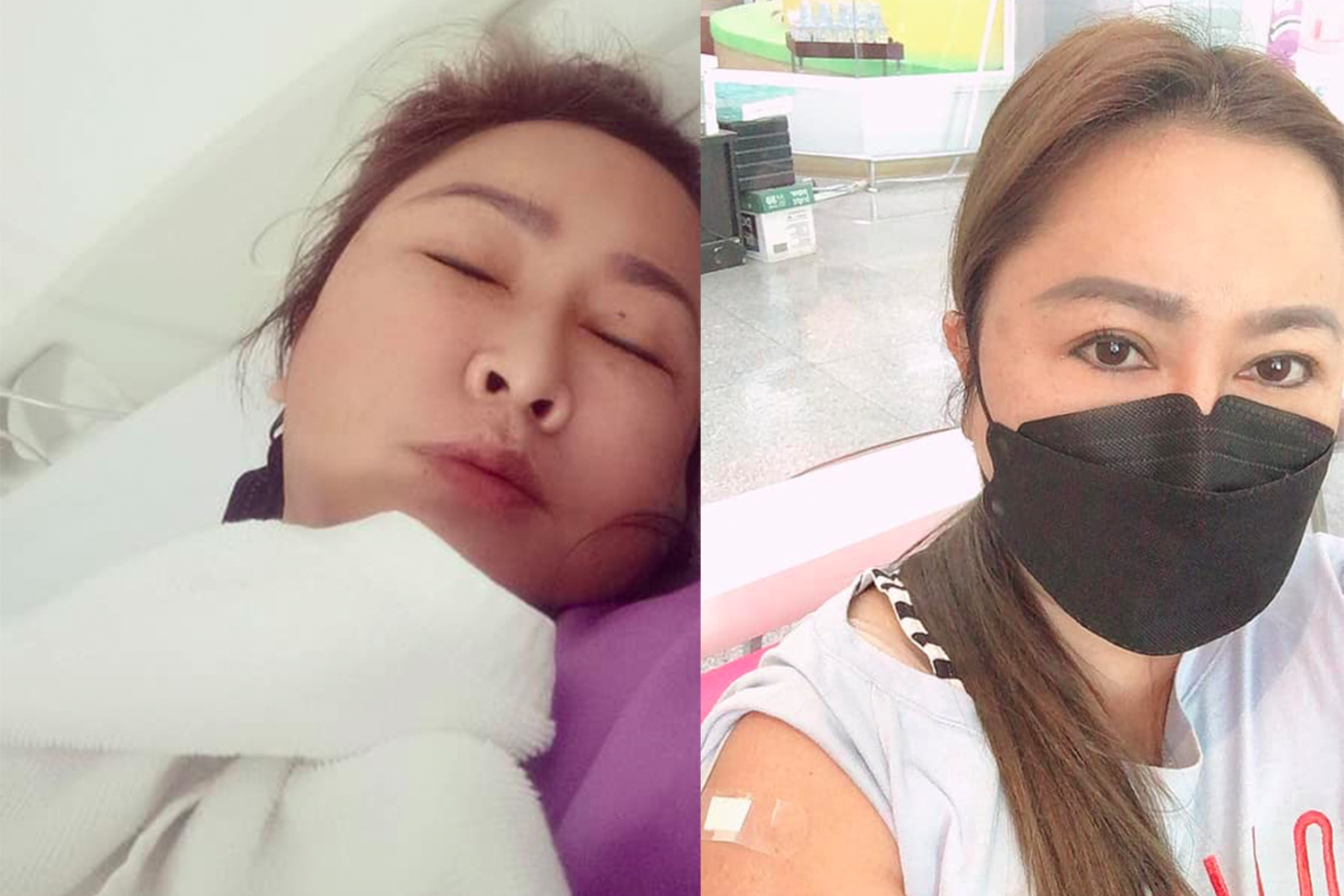 และต่อมาได้โพสต์ภาพตัวเองขณะรักษาตัวที่โรงพยาบาล พร้อมข้อความว่า "และแล้วที่กลัวมันก็เกิดขึ้น จะดีใจ หรือ เสียใจดีที่หมอบอกว่าอายุขนาดนี้แล้วภูมิต้านทานทำงานดีมาก ไข้ขึ้น 40องศา คลื่นไส้ หนาวชนิดที่ห่มผ้ากี่ผืนก็ไม่หาย ใส่เสื้อหนาวกี่ตัวก็ไม่อุ่น หลังจากฉีดวัคซีน เพียงแค่วันเดียว เวียนหัว ไข้ก็ไม่ยอมลดนี่ใช่ไหมที่เขาเรียกผลข้างเคียง ถึงกับต้อง เข้า ICU ห้องปลอดเชื้อเลย" ซึ่งแฟนๆ ต่างก็พากันเข้ามาส่งกำลังใจให้เธอกันเป็นจำนวนมาก