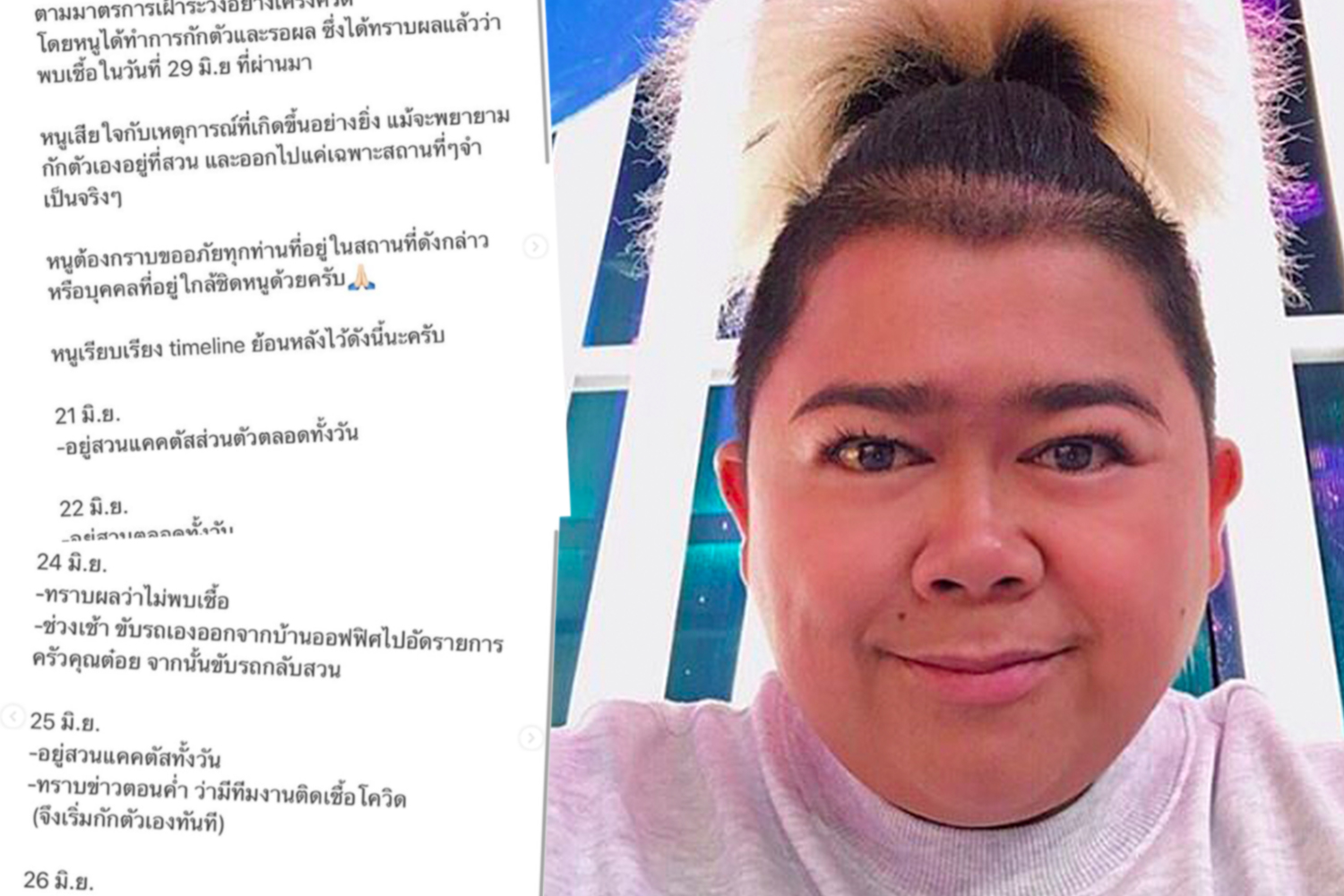25 มิ.ย. -อยู่สวนแคคตัสทั้งวัน -ทราบข่าวตอนค่ำ ว่ามีทีมงานติดเชื้อโควิด (จึงเริ่มกักตัวเองทันที)
