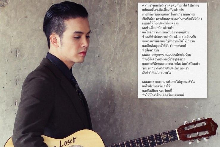 “ความจริงผมกับวีเราเคยคบกันมาได้ 1 ปีกว่าๆ แต่ตอนนี้เราเป็นเพื่อนกันแล้วครับ การที่น้องวีต้องออกมาโกหกเกี่ยวกับความสัมพันธ์ของเราเป็นเพราะผมเป็นคนเริ่มต้นไว้เอง ผมขอให้น้องปิดมาตั้งแต่แรก ผมทำเพื่อปกป้องน้องเค้า แต่ในอีกทางผมยอมรับอย่างลูกผู้ชายว่าผมก็ทำไปเพราะปกป้องตัวเองเหมือนกัน จนบางครั้งน้องเองก็รู้สึกว่าผมไม่ให้เกียรติ และอึดอัดทุกครั้งที่ต้องโกหกต่อหน้าพี่ๆ สื่อมวลชน ผมออกมาพูดเพราะแน่นอนมีคนไม่น้อยที่รับรู้ถึงความสัมพันธ์จริงๆ ของเรา และการที่มีคนออกมาต่อว่าน้องโดยใช้ถ้อยคำรุนแรงเกี่ยวกับการปกปิดของเรามันทำให้ผมไม่สบายใจผมเลยอยากออกมาอธิบายให้ทุกคนเข้าใจ แก้ไขสิ่งที่ผมเริ่มเอาไว้ และถือเป็นการขอโทษที่ทำให้น้องต้องเดือดร้อน #แอมมี่”