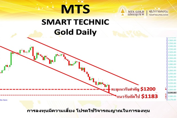 ราคาทองคำยังคงเคลื่อนไหวในทิศทางขาลงโดยทำจุดต่ำสุดใหม่ในรอบ 10 เดือน ที่ระดับ 1,191 เหรียญ โดยหลุดแนวรับสำคัญทางจิตวิทยาที่ระดับ 1,200 เหรียญลงมา โดยราคาปรับตัวลดลงเกือบ 20 เหรียญ ในการซื้อขายช่วงคืนวันศุกร์ที่ผ่านมา นักวิเคราะห์ของ MTS Gold Futures ยังระบุว่า โอกาสที่ราคาทองคำจะลงไปทดสอบจุดต่ำสุดเดิมที่ระดับ 1,183 เหรียญ ยังมีโอกาสอยู่สูง จึงแนะนำให้นักลงทุนพิจารณาตามลักษณะทางเทคนิคที่แนวรับที่ระดับ 1,183 เหรียญ และแนวต้านที่ระดับ 1,210 เหรียญ