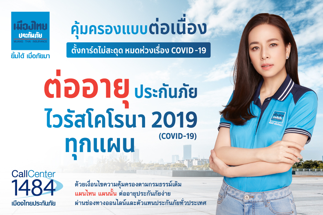 สำหรับขั้นตอนการต่ออายุกรมธรรม์ประกันภัยไวรัสโคโรนา 2019 (COIVD-19) กรณีลูกค้าแจ้งเบอร์โทรศัพท์ ทางบริษัทฯ จะนำส่งรายละเอียดการแจ้งเตือนต่ออายุกรมธรรม์พร้อมลิงค์เว็บไซต์ที่มีข้อมูลกรมธรรม์เดิมให้แก่ลูกค้า ซึ่งสามารถคลิกต่ออายุผ่านทาง SMS เพื่อตรวจสอบความคุ้มครอง ข้อมูลส่วนบุคคล และกรณีลูกค้าไม่แจ้งเบอร์โทรศัพท์ สามารถคลิกเข้าเว็บไซต์ www.muangthaiinsurance.com เพื่อตรวจสอบสถานะความคุ้มครอง และทำรายการต่ออายุกรมธรรม์ หรือติดต่อตัวแทนประกันภัยใกล้บ้านท่าน โดยลูกค้าทั้ง 2 กรณี สามารถชำระเบี้ยประกันภัยผ่านบัตรเครดิต สแกน QR Code หรือชำระผ่านเคาน์เตอร์เซอร์วิสที่ร่วมรายการ และรอรับ SMS จัดส่งกรมธรรม์แบบอิเล็กทรอนิกส์ (e-policy) หลังจากทำรายการชำระเงินสำเร็จภายใน 3 วันทำการ สามารถสอบถามข้อมูลเพิ่มเติมได้ที่ Call Center 1484 หรือ Line@ : mtifriends