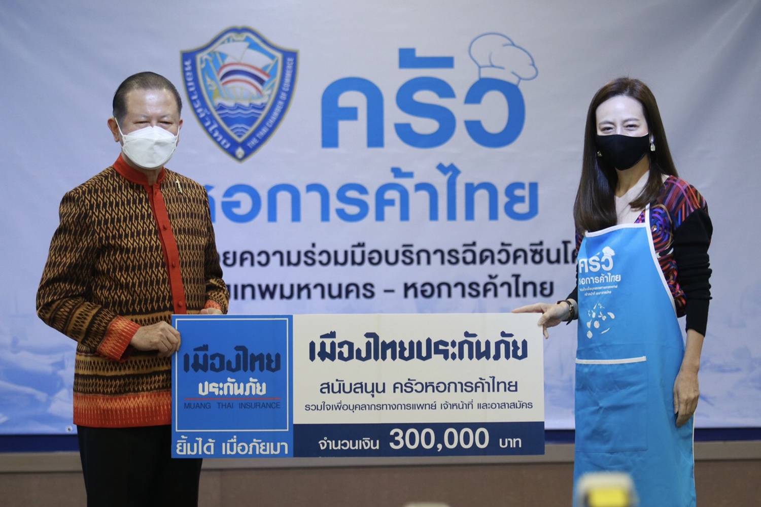 บริษัท เมืองไทยประกันภัย จำกัด (มหาชน) หรือ MTI นำทีมโดย คุณนวลพรรณ ล่ำซำ กรรมการผู้จัดการ และประธานเจ้าหน้าที่บริหาร ร่วมสนับสนุนมอบเงิน 300,000 บาท ให้แก่คุณสนั่น อังอุบลกุล ประธานกรรมการหอการค้าไทยและสภาหอการค้าแห่งประเทศไทย เพื่อเป็นฟันเฟืองส่วนหนึ่งในการขับเคลื่อนโครงการ “ครัวหอการค้าไทย รวมใจเพื่อบุคลากรทางการแพทย์ เจ้าหน้าที่และอาสาสมัคร” ตั้งครัวส่งอาหารสนับสนุนบุคลากรทางการแพทย์ประจำหน่วยความร่วมมือบริการฉีดวัคซีนโควิด-19 ทั่วกรุง เมื่อวันที่ 4 มิถุนายน ที่ผ่านมา ณ ห้อง Activity Hall อาคารบรรเจิดชลวิจารณ์ หอการค้าไทย