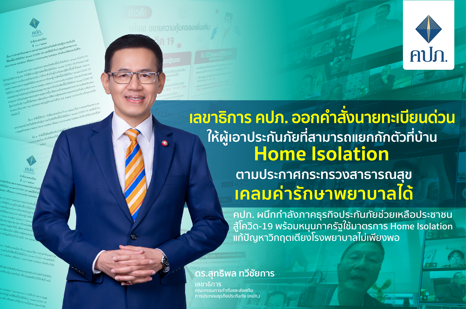 ดร.สุทธิพล ทวีชัยการ เลขาธิการคณะกรรมการกำกับและส่งเสริมการประกอบธุรกิจประกันภัย (เลขาธิการ คปภ.) เปิดเผยว่า นับตั้งแต่สถานการณ์การแพร่ระบาดของโควิด-19 ในประเทศไทย เข้าสู่ระลอก 3 ที่กระจายไปทั่วเป็นวงกว้าง และเกิดคลัสเตอร์ใหม่ ๆ เพิ่มขึ้นอย่างต่อเนื่อง สำนักงาน คปภ. ไม่ได้นิ่งนอนใจ ได้ออกคำสั่งนายทะเบียนที่เกี่ยวข้อง เพื่อรองรับมาตรการของรัฐบาลที่ได้ปรับให้สอดคล้องกับสถานการณ์การแพร่ระบาดของโควิด-19 และเพื่อสร้างความมั่นใจให้กับประชาชนผู้เอาประกันภัย โดยการขยายความคุ้มครองของกรมธรรม์ประกันภัยที่เกี่ยวข้อง ได้แก่ ขยายความคุ้มครองการรักษาพยาบาลเนื่องจากการติดเชื้อโควิด-19 ในโรงพยาบาลสนามหรือ hospitel ให้ได้รับความคุ้มครองตามเงื่อนไขของกรมธรรม์ประกันภัย เช่นเดียวกับการรักษาพยาบาลในโรงพยาบาลทั่วไป และขยายความคุ้มครองกรณีผลกระทบจากการฉีดวัคซีนป้องกันโควิด-19 ที่กระทำการโดยแพทย์ พยาบาล หรือบุคลากรที่ได้รับการอนุญาตอย่างถูกต้องตามกฎหมายแห่งราชอาณาจักรไทย ไม่ว่าจะดําเนินการ ณ สถานที่ใดก็ตาม ให้ได้รับความคุ้มครองตามเงื่อนไขของกรมธรรม์ประกันภัย เช่นเดียวกับการฉีดวัคซีนในโรงพยาบาลทั่วไป