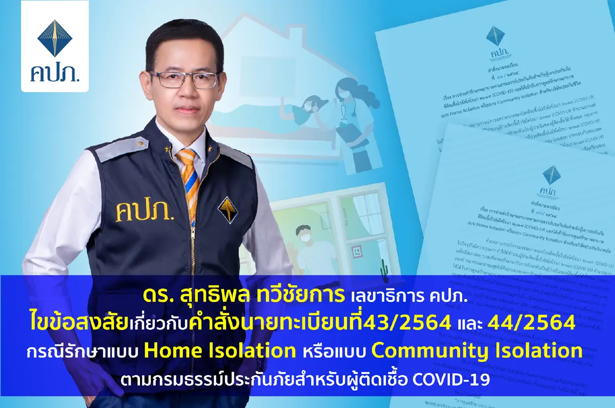 ดร.สุทธิพล ทวีชัยการ เลขาธิการ คปภ. ไขข้อสงสัย เกี่ยวกับคำสั่งนายทะเบียน ที่ 43/2564 และ 44/2564 กรณีการรักษาแบบ Home Isolation หรือแบบ Community Isolation ตามกรมธรรม์ประกันภัยสำหรับผู้เอาประกันภัยที่ติดเชื้อโควิด-19