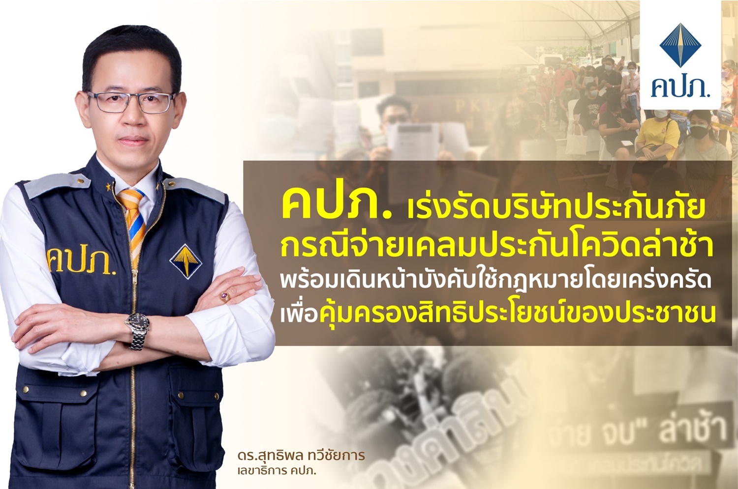 คปภ. เร่งรัดบริษัทประกันภัยกรณีจ่ายเคลมประกันโควิดล่าช้า พร้อมเดินหน้าบังคับใช้กฎหมายโดยเคร่งครัด เพื่อคุ้มครองสิทธิประโยชน์ของประชาชน
