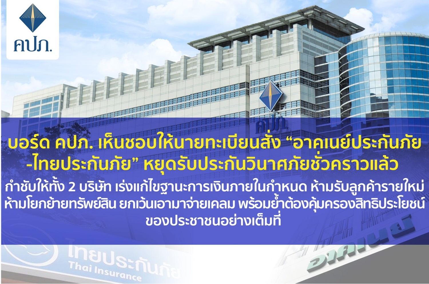 บอร์ด คปภ. เห็นชอบสั่ง “อาคเนย์ประกันภัย-ไทยประกันภัย” หยุดรับประกันวินาศภัยชั่วคราวแล้ว