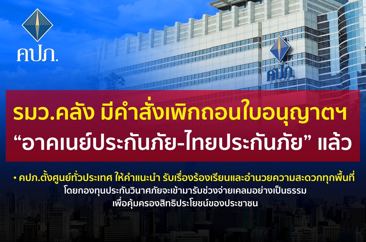 ปิด “อาคเนย์ประกันภัย-ไทยประกันภัย” โดยกองทุนประกันวินาศภัยจะเข้ามารับช่วงจ่ายเคลมอย่างเป็นธรรมเพื่อคุ้มครองสิทธิประโยชน์ของประชาชน