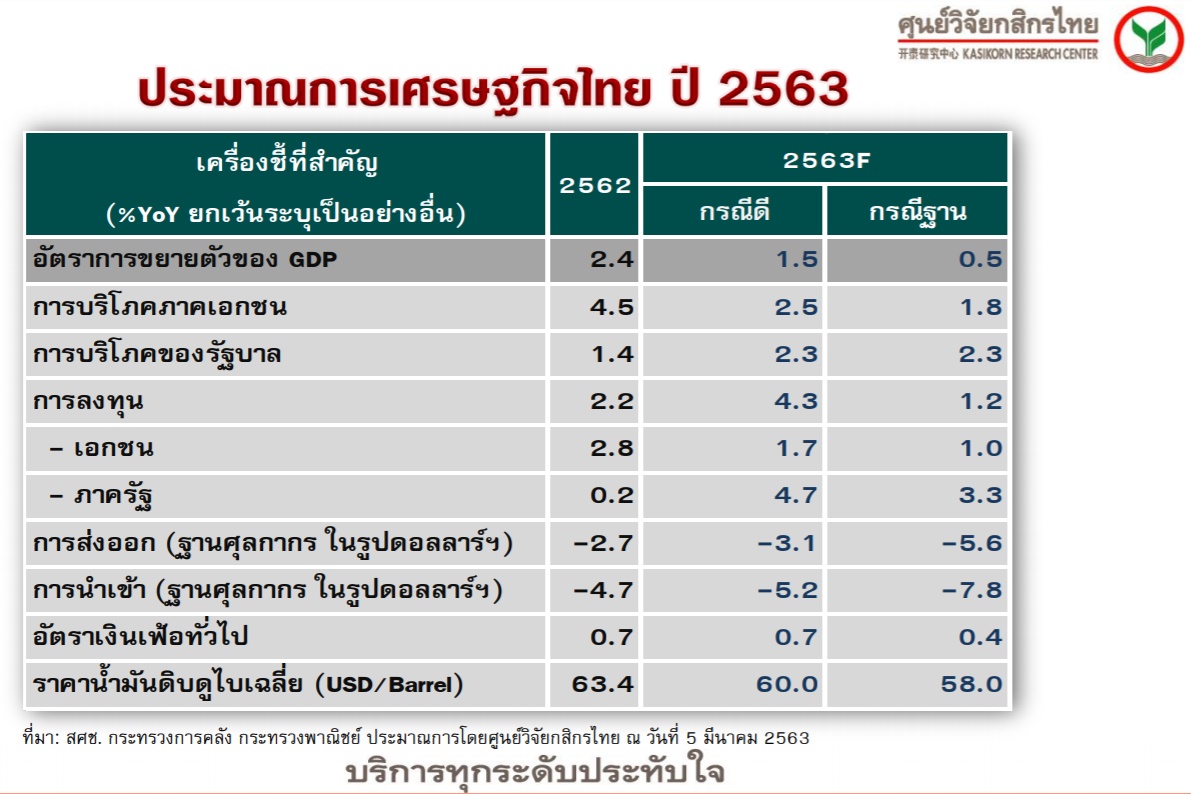 นางสาวณัฐพร ตรีรัตน์ศิริกุล ผู้ช่วยกรรมการผู้จัดการ บริษัท ศูนย์วิจัยกสิกรไทย จำกัด เปิดเผยว่า ภายใต้เงื่อนไขที่มองว่า สถานการณ์การระบาดของไวรัสโควิด-19 ในจีน สามารถควบคุมจำนวนการเพิ่มขึ้นของผู้ติดเชื้อได้ในระยะ 1-2 เดือนข้างหน้า สถานการณ์ในประเทศอื่น ๆ โดยเฉพาะประเทศอิตาลีและเกาหลีใต้สามารถควบคุมได้ในไตรมาส 2 และสถานการณ์ในไทย ยังไม่ปรากฎเหตุการณ์ที่จำนวนผู้ติดเชื้อเพิ่มขึ้นอย่างรวดเร็วในเวลาสั้น ๆ นั้น คาดว่าจะทำให้เห็นจีดีพีในปีนี้ขยายตัวเหลือ 0.5% จากประมาณการเดิมที่ 2.7%