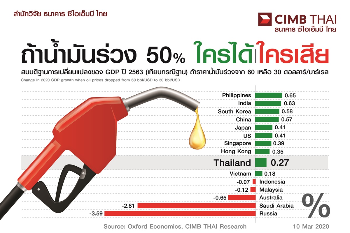 สำนักวิจัยธนาคาร ซีไอเอ็มบี ไทย ได้ใช้โมเดลจากอ๊อกฟอร์ดอิโคโนมิกส์ คาดการณ์การเปลี่ยนแปลงของการเติบโตทางเศรษฐกิจ (GDP) ของประเทศสำคัญ (เทียบกับฐาน) กรณีราคาน้ำมันร่วงลง 50% พบว่า กลุ่มอาเซียนสำคัญ ประเทศที่ GDP จะได้รับอานิสงส์มากที่สุดคือ ประเทศฟิลิปปินส์ เพราะเป็นประเทศนำเข้าน้ำมันสุทธิปริมาณมาก