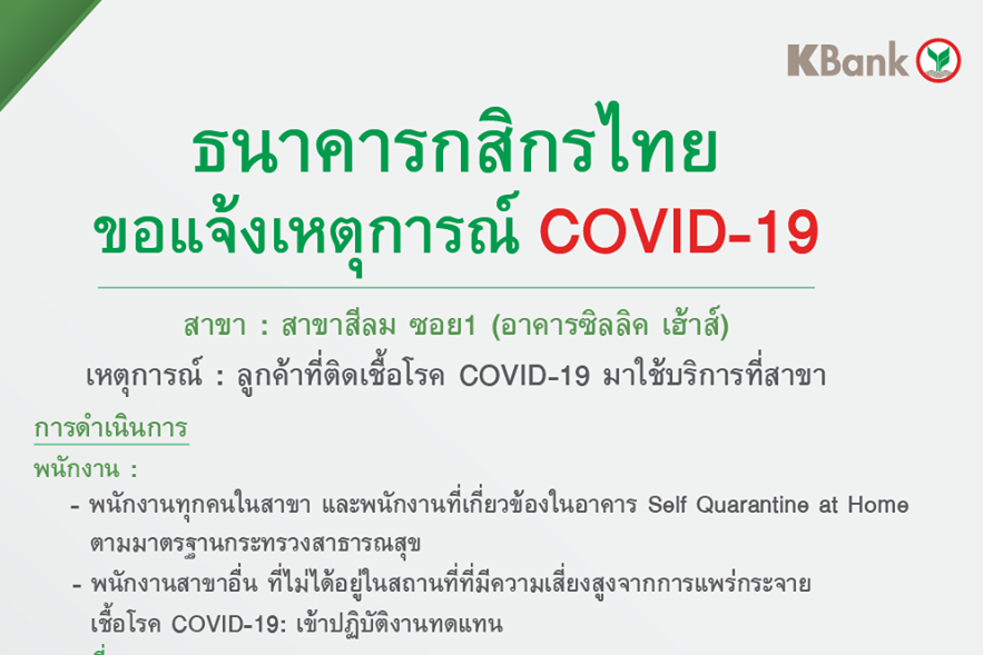 3. ประกาศปิดสาขาสีลม ซอย1 (อาคารซิลลิค เฮ้าส์) ชั่วคราว ตั้งแต่วันที่ 26 - 27 มี.ค. 2563 ค้าสามารถใช้บริการผ่านช่องทางอิเล็กทรอนิกส์ และสาขาใกล้เคียงได้ตามปกติ ทั้งนี้ปัจจุบันยังไม่พบพนักงานสาขาติดเชื้อโรค COVID-19