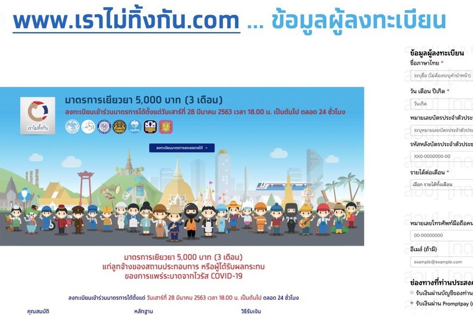 ในวันนี้ (28 มีนาคม 2563) ตั้งแต่เวลา 18.00 น. เป็นต้นไป เป็นวันแรกที่เปิดให้แรงงาน ลูกจ้างชั่วคราวและผู้ประกอบอาชีพอิสระที่ไม่ได้อยู่ในระบบประกันสังคม และได้รับผลกระทบการแพร่ระบาดของเชื้อไวรัสโคโรนา (COVID-19) สามารถลงทะเบียนเข้าร่วมมาตรการ เยียวยา 5,000 บาท เป็นเวลา 3 เดือน ผ่านเว็บไซต์ www.เราไม่ทิ้งกัน.com
