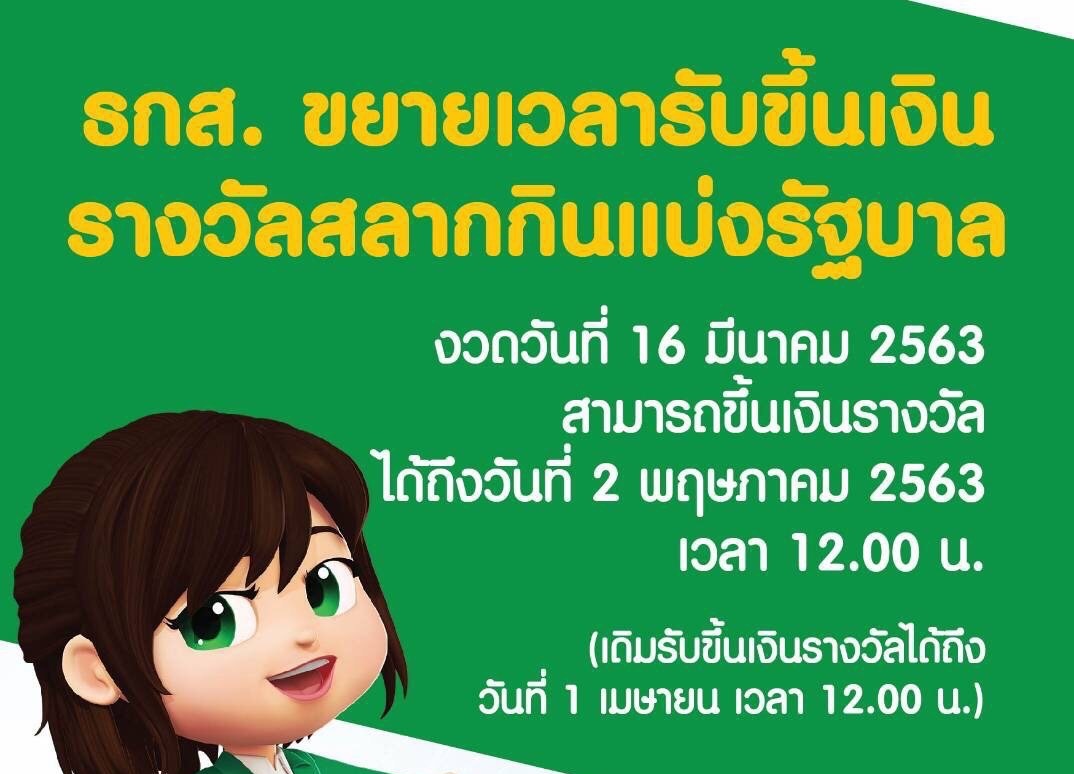 ธ.ก.ส. ในฐานะหน่วยงานที่ให้บริการจ่ายเงินรางวัลสลากกินแบ่งรัฐบาล ขอแจ้งขยายเวลาให้บริการจ่ายเงินสลากฯ ผ่านเคาน์เตอร์สาขาของธนาคาร ของงวดวันที่ 16 มีนาคม 2563 จากเดิม สิ้นสุดการให้บริการจ่ายเงินรางวัลฯในวันที่ 1 เมษายน 2563 เวลา 12.00 น. เป็น วันที่ 2 พฤษภาคม 2563 เวลา 12.00 น. เนื่องจากสำนักงานสลากกินแบ่งรัฐบาลเปลี่ยนแปลงวันออกรางวัลสลากกินแบ่งรัฐบาลงวดวันที่ 1 เมษายน 2563 เป็นวันที่ 2 พฤษภาคม 2563 ทำให้การให้บริการจ่ายเงินรางวัลงวดปัจจุบันขยายเวลาถึงช่วงเวลาดังกล่าว โดยสามารถสอบถามรายละเอียดเพิ่มเติมได้ที่ Call Center 02 555 0555
