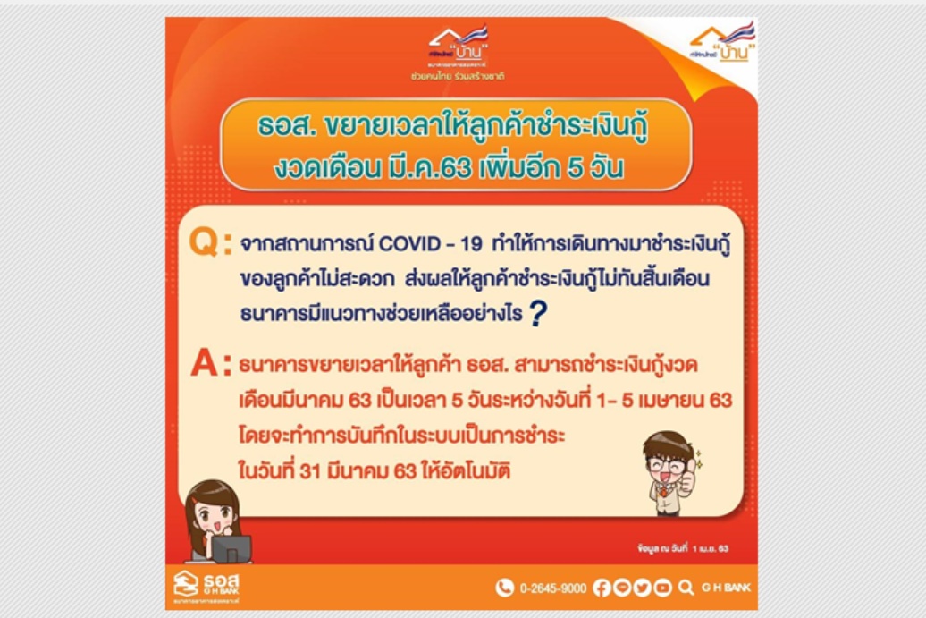 ธอส. ประกาศขยายเวลาให้ลูกค้าชำระเงินกู้ งวดเดือนมีนาคมเพิ่มอีก 5 วัน