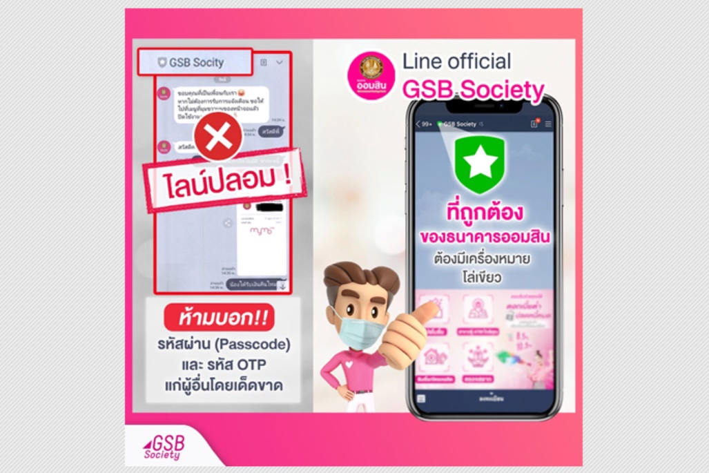 จากสถานการณ์ข้างต้น ได้มีกลุ่มมิจฉาชีพ แฝงตัวอยู่ในสื่อโซเชียล โดยได้ปลอมเพจและไลน์ ธนาคารออมสิน GSB Society และเข้าไปแสดงความคิดเห็นพร้อมชักชวนให้เป็นเพื่อนในไลน์ เสมือนว่าตนเองเป็นพนักงานธนาคารที่จะให้คำแนะนำ ให้ความช่วยเหลือได้และหลอกถามข้อมูลทางการเงิน เช่น ขอทราบเลขที่สมุดบัญชีเงินฝาก เลขที่บัตรประจำตัวประชาชน รหัสผ่าน MyMo และรหัสผ่าน OTP สุดท้ายอาจสวมรอยถอนเงินออกจากบัญชีได้ ทั้งนี้ธนาคารได้เฝ้าระวังและติดตามความเคลื่อนไหวไลน์และเฟสบุ๊คแฟนเพจที่มีการนำโลโก้ธนาคารออมสินไปใช้ในสื่อโซเชียลอย่างใกล้ชิด หากทำให้ธนาคารเกิดความเสียหายแก่ภาพลักษณ์และชื่อเสียง ธนาคารจะดำเนินตามกฎหมาย