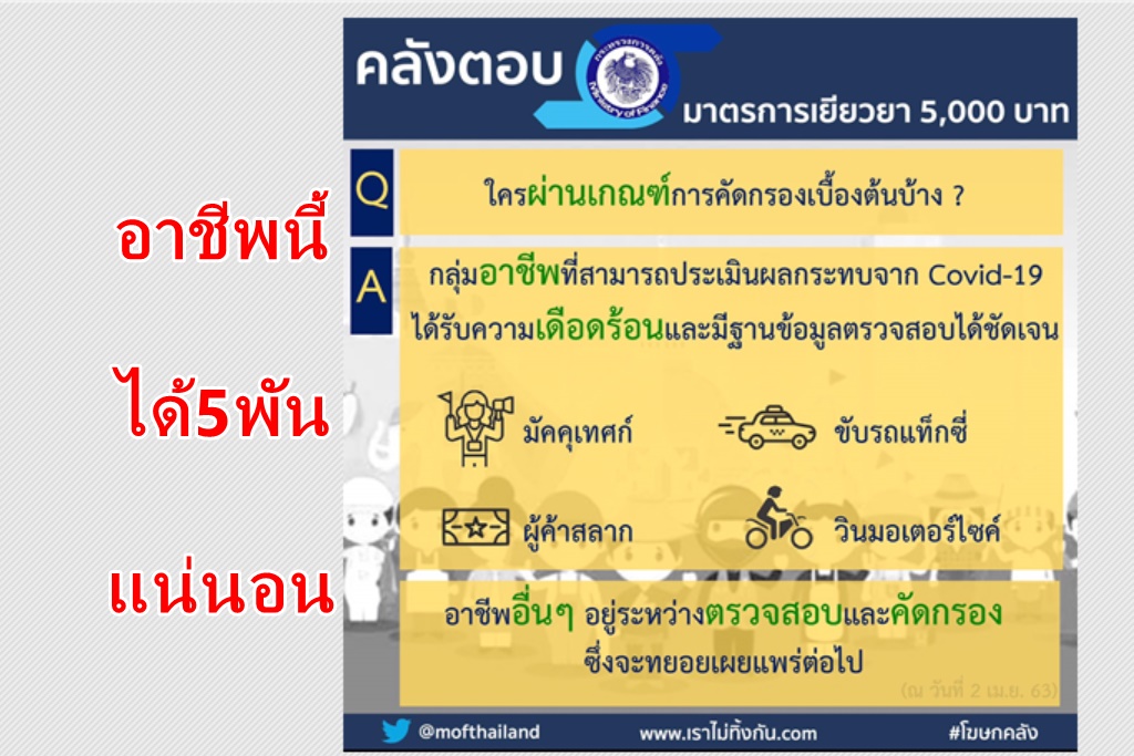 ทั้งนี้กระทรวงการคลัง แจ้งว่าผู้ที่ได้รับเงินเยียวยา 5,000 บาทแน่นอน มี 4 อาชีพ คือ คือ มัคคุเทศก์ คนขับรถแท็กซี่ ผู้ค้าสลาก และวินมอเตอร์ไซค์รับจ้าง ส่วนอาชีพอื่นๆอยู่ระหว่างตรวจสอบและคัดกรอง ซึ่งจะมีการเผยแพร่ต่อไป