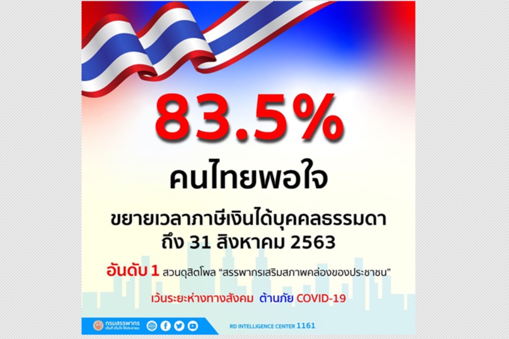 นางสมหมาย ศิริอุดมเศรษฐ ที่ปรึกษาด้านยุทธศาสตร์การจัดเก็บภาษี (กลุ่มธุรกิจพลังงาน) ในฐานะโฆษกกรมสรรพากร เปิดเผยว่า จากผลสำรวจของ สวนดุสิตโพล มหาวิทยาลัยสวนดุสิต ที่สำรวจความคิดเห็นของประชาชนทั่วประเทศทางระบบออนไลน์ ระหว่างวันที่ 27 – 30 เมษายน 2563 เรื่อง “ความพึงพอใจ ต่อมาตรการต้านโควิด - 19 ของรัฐบาล” ในหัวข้อ “มาตรการช่วยเหลือเยียวยาประชาชนของรัฐบาลที่ประชาชนพึงพอใจ” ผลปรากฏว่า มาตรการเลื่อนชำระภาษีเงินได้บุคคลธรรมดา ออกไปถึง 31 สิงหาคม 2563 ของกรมสรรพากร ได้รับความพึงพอใจจากประชาชนสูงสุด อันดับ 1 ถึงร้อยละ 83.5 กรมสรรพากรเชื่อว่า การขยายเวลาดังกล่าวจะช่วยประชาชนผู้เสียภาษีให้ปลอดภัยจากการแพร่ระบาดของโรคติดเชื้อไวรัสโคโรนา 2019 (COVID – 19) อีกทั้งเพื่อเป็นการดำเนินการให้สอดคล้องกับนโยบายของรัฐบาล ในการรณรงค์ให้ประชาชนอยู่บ้าน ลดการเดินทาง และมีการเว้นระยะห่างทางสังคม (Social Distancing) และยังช่วยเพิ่มสภาพคล่องของเงินในกระเป๋า ส่งผลดีต่อการดำรงชีวิตของประชาชน และระบบเศรษฐกิจของประเทศ”