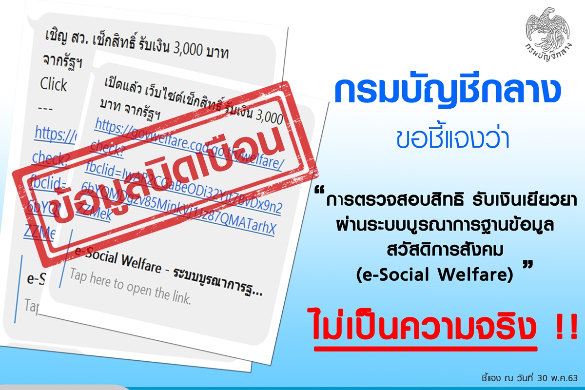 กรมบัญชีกลาง ขอชี้แจงว่า กรณีดังกล่าวไม่เป็นความจริง ระบบ e-Social Welfare ของกรมบัญชีกลาง คือระบบที่ใช้ในการตรวจสอบสิทธิของผู้มีสิทธิรับเงินสวัสดิการที่จ่ายกรณีปกติเป็นรายเดือน