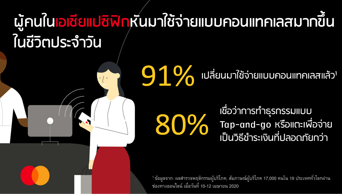มาสเตอร์การ์ด รายงานว่าในช่วงเดือนกุมภาพันธ์และมีนาคมที่ผ่านมา หลายประเทศออกกฎระเบียบคุมเข้มมาตรการรักษาระยะห่างทางสังคม หรือ Social Distancing ทำให้ผู้คนจำนวนมากหันไปใช้จ่ายแบบ “คอนแทคเลส” หรือ “การใช้จ่ายแบบไร้สัมผัส” ในการจับจ่ายของใช้ในชีวิตประจำวัน จากผลสำรวจพฤติกรรมผู้บริโภคทั่วโลกของมาสเตอร์การ์ด 79% ของประชากรทั่วโลกและ 91% ของประชากรในภูมิภาคเอเชียแปซิฟิกกล่าวว่า ตอนนี้พวกเขาได้หันมาใช้จ่ายแบบคอนแทคเลสแล้ว โดยให้เหตุผลเรื่องความปลอดภัยและลดความกังวลในการสัมผัสเงินสดและอุปกรณ์ต่างๆของการชำระเงิน