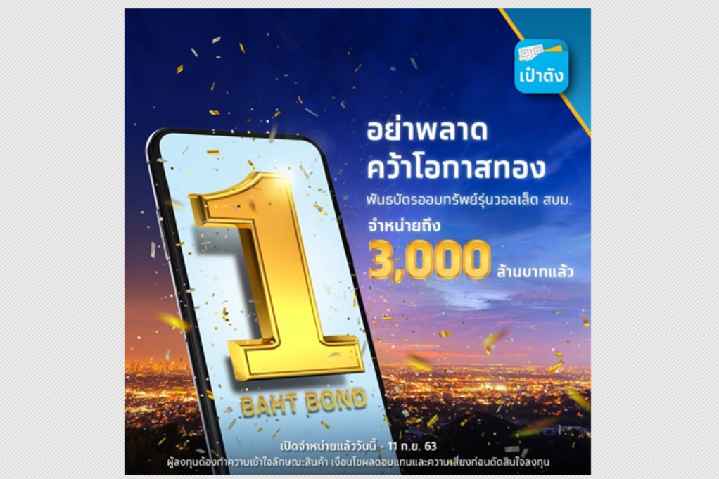 ธนาคารกรุงไทย แจ้งว่า พันธบัตรออมทรัพย์รุ่นวอลเล็ต สบม. ของกระทรวงการคลัง ครั้งที่ 2 อัตรา 1.70% จ่ายดอกเบี้ย 2 ครั้งต่อปี อายุ 4 ปี ขณะนี้จำหน่ายไปแล้ว 3 พันล้านบาท ยังเหลือให้ลงทุนอีก 2 พันล้านบาท ซื้อขั้นต่ำ 100 บาท สนใจเพียงโหลดแอปพลิเคชันเป๋าตังและซื้อพันธบัตรได้ง่ายๆด้วยตัวเอง