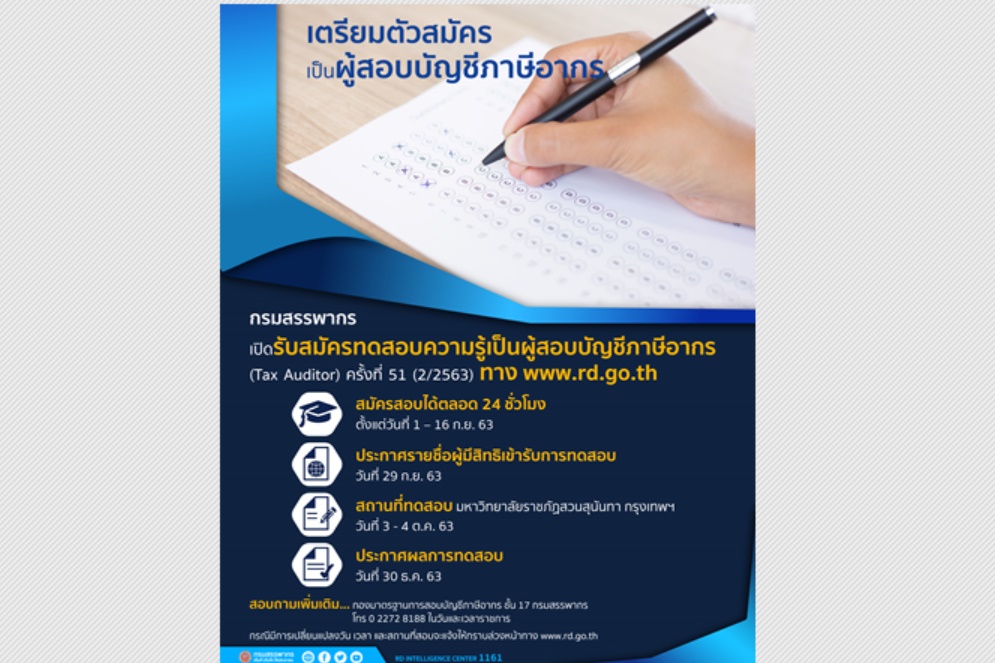กรมสรรพากรขอเชิญชวนผู้สำเร็จการศึกษาปริญญาตรี (สาขาทางการบัญชี) เข้ารับการทดสอบเป็นผู้สอบบัญชีภาษีอากร (Tax Auditor) โดยสามารถสมัครผ่านอินเทอร์เน็ตที่เว็บไซต์กรมสรรพากร www.rd.go.th ระหว่างวันที่ 1 - 16 กันยายน 2563
