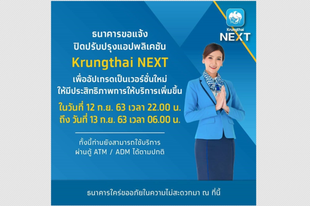 ก่อนหน้านี้ ธนาคารกรุงไทย แจ้งปืดปรับปรุง แอปพลิเคชัน Krungthai NEXT วันที่ 11 ก.ย. 2563 เวลา 20.00 น. ถึงวันเสาร์ที่ 12 ก.ย. 2563 เวลา 01.00 น. โดยล่าสุดมีการแจ้งปิดปรับปรุงระบบดังกล่าวเพิ่มอีกครั้ง