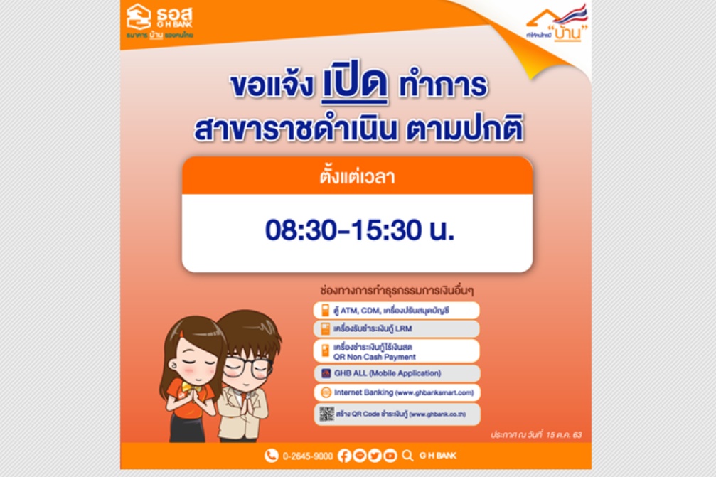 ธนาคารอาคารสงเคราะห์ (ธอส.) ได้ประกาศว่า ธอส. สาขาราชดำเนินการ เปิดให้บริการปกติตั้งแต่เวลา 08.30-15.30 น. ลูกค้าที่ต้องการใช้บริการสามารถไปดำเนินการได้ตามเวลาดังกล่าว