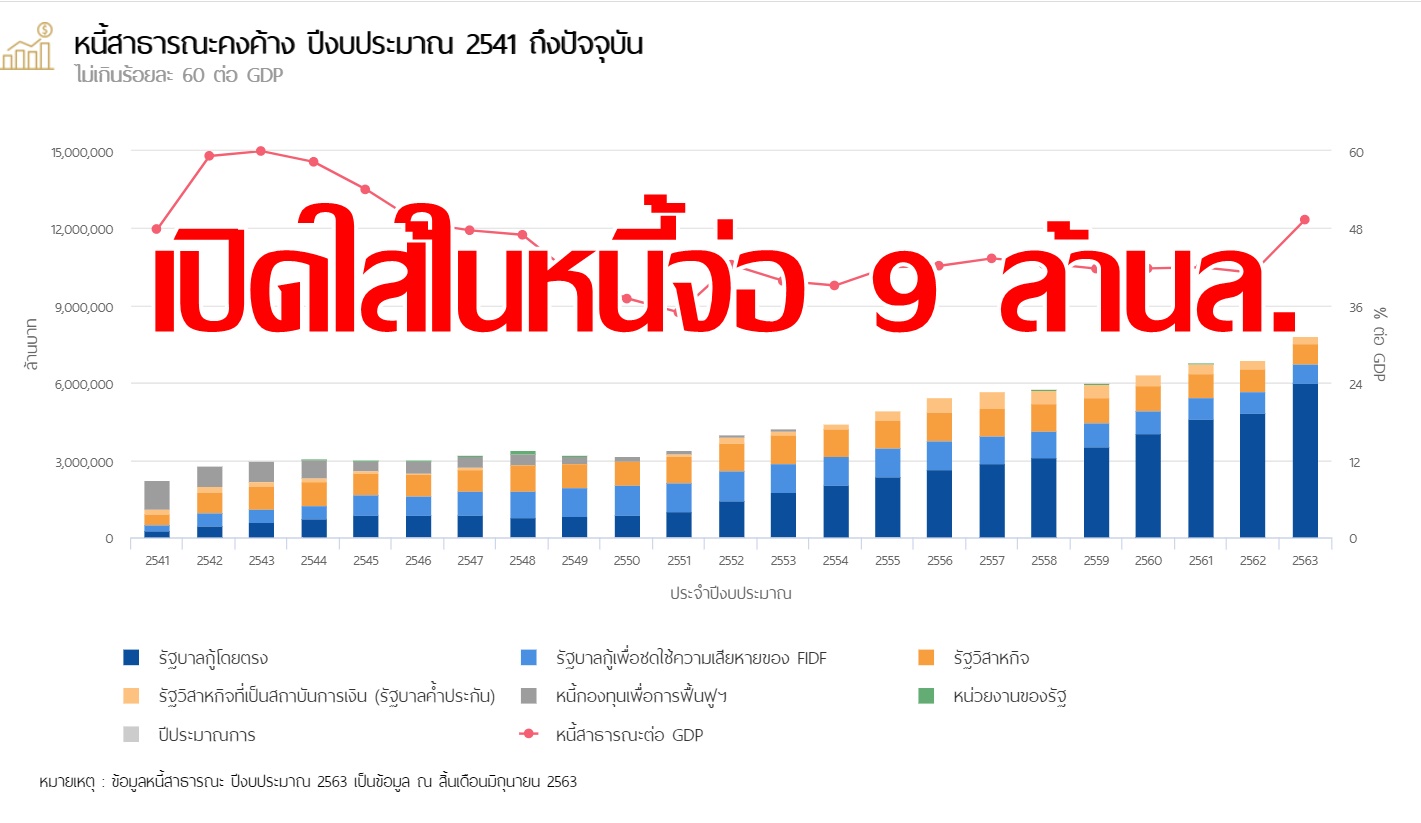 ในส่วนของหนี้ที่รัฐบาลก่อเพิ่มในปีงบประมาณ 2563 ได้แก่ การกู้เพื่อชดเชยขาดดุลงบประมาณ 4.91 แสนล้านบาท กู้เพื่อฟื้นฟูและเสริมสร้างความมั่นคงทางเศรษฐกิจ 3.55 แสนล้านบาท และเงินกู้ภายใต้ พ.ร.ก. โควิด-19 อีก 3.35 แสนล้านบาท