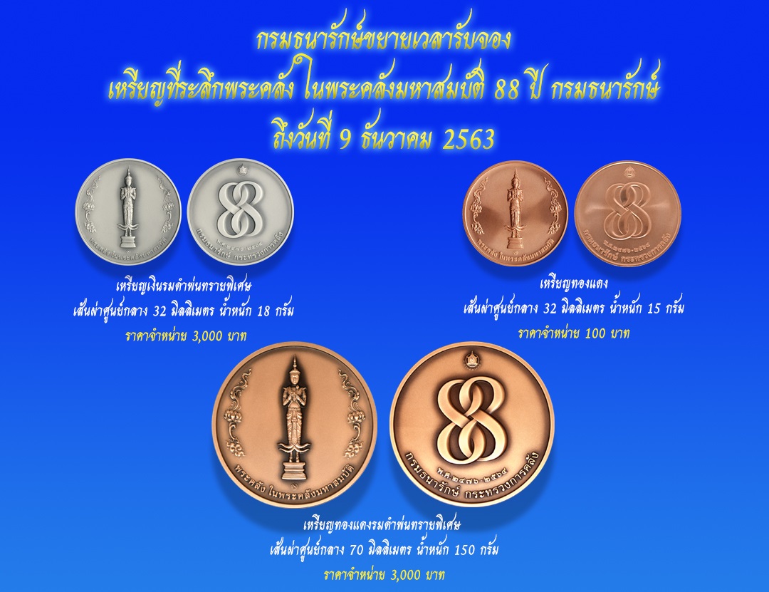 กรมธนารักษ์ขยายเวลาการรับจองเหรียญที่ระลึกพระคลัง ในพระคลังมหาสมบัติ 88 ปี กรมธนารักษ์ จนถึงวันที่ 9 ธ.ค.นี้