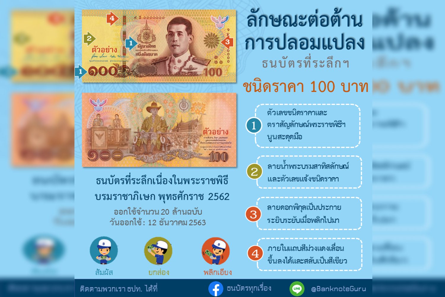 โดยประชาชนสามารถตรวจสอบธนบัตรด้วย 3 วิธีง่าย ๆ คือ สัมผัส ยกส่อง พลิกเอียง โดยมีจุดสังเกตที่สำคัญ เช่น ความนูนของการพิมพ์บอกชนิดราคาที่มุมธนบัตรและคำว่ารัฐบาลไทย ลายน้ำ แถบสีที่มีภาพเคลื่อนไหว และหมึกพิมพ์แม่เหล็กสามมิติเปลี่ยนสีได้ เป็นต้น