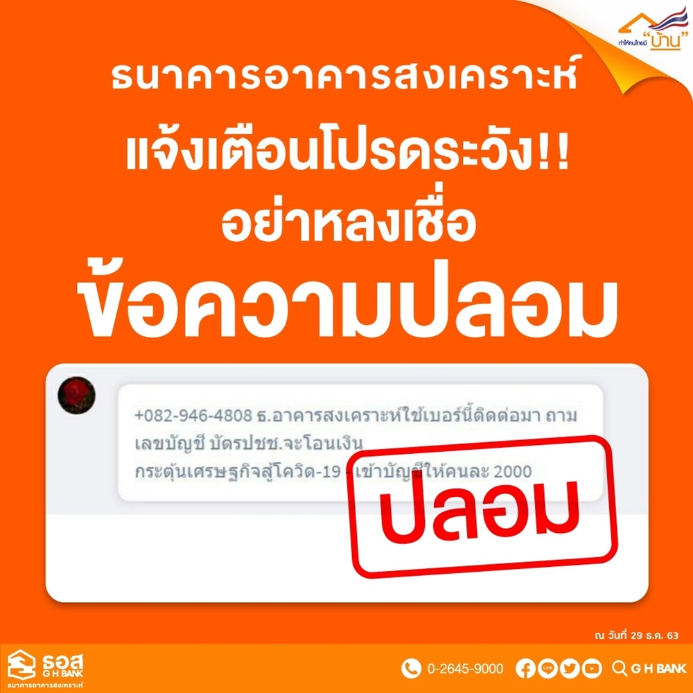 ทั้งนี้ หากลูกค้าประชาชนได้รับข้อความในลักษณะเดียวกันนี้ ขอความร่วมมือไม่ส่งต่อหรือแชร์ข้อมูล เพื่อไม่ให้เกิดความสับสน สอบถามรายละเอียด หรือ ติดต่อข้อมูลข่าวสารของธนาคารเพิ่มเติมได้ที่ www.ghbank.co.th หรือ ศูนย์ลูกค้าสัมพันธ์(Call Center) โทร 0-2645-9000 และ Facebook Fanpage ธนาคารอาคารสงเคราะห์