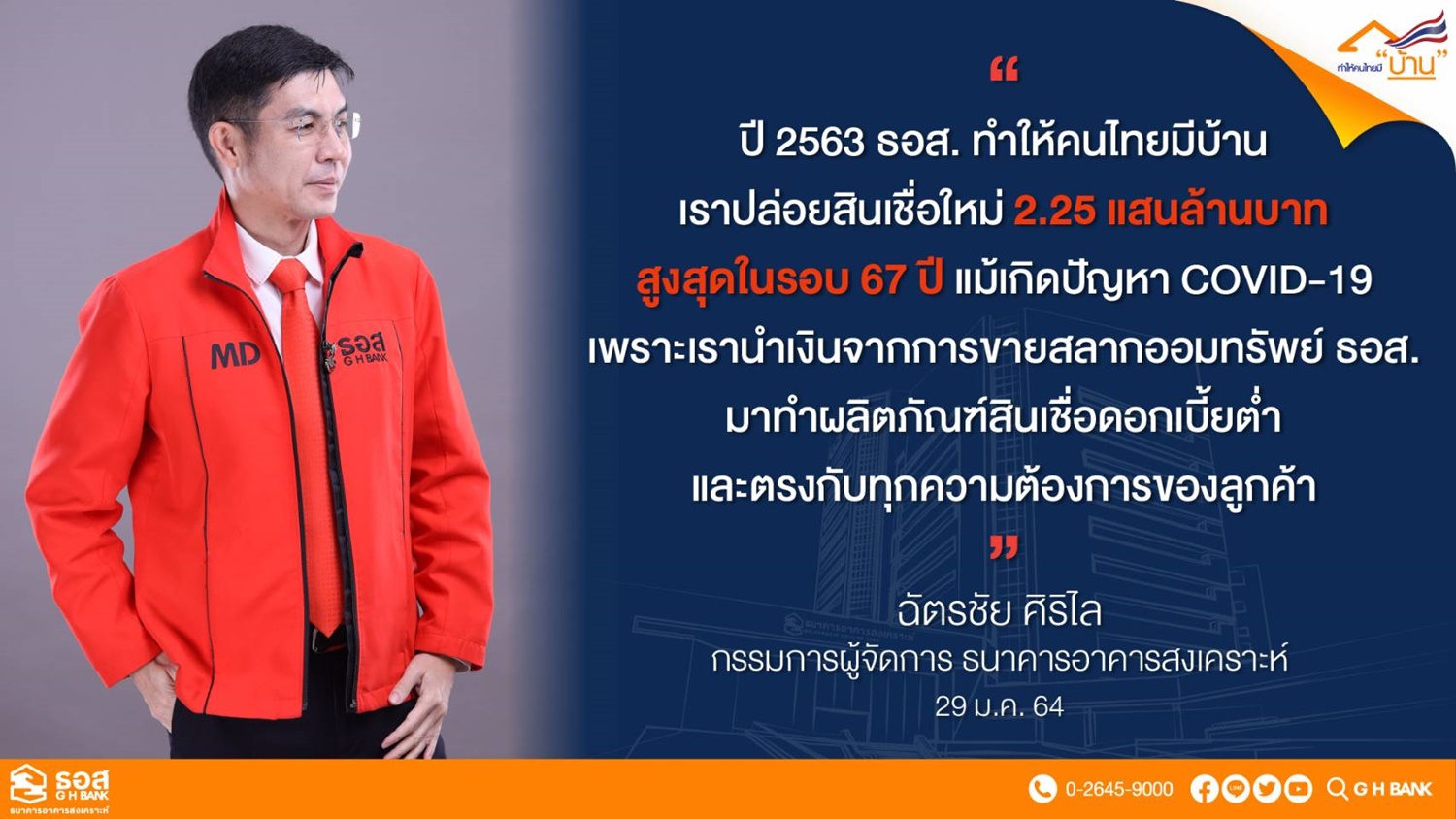 นายฉัตรชัย ศิริไล กรรมการผู้จัดการ ธนาคารอาคารสงเคราะห์ (ธอส.) เปิดเผยถึงผลการดำเนินงาน ในปี 2563 เมื่อเทียบกับ ณ สิ้นปี 2562 ว่า แม้ในปี 2563 จะเกิดปัญหาการแพร่ระบาดของเชื้อไวรัสโคโรนา 2019 (COVID-19) ซึ่งมีผลกระทบต่อภาพรวมเศรษฐกิจไทย แต่ ธอส. ยังคงสามารถสร้างโอกาสให้คนไทยมีบ้านตามพันธกิจได้อย่างต่อเนื่อง เห็นได้จากจำนวนเงินสินเชื่อปล่อยใหม่ที่ทำได้สูงสุดในรอบ 67 ปี นับตั้งแต่ก่อตั้งธนาคารที่ 225,151 ล้านบาท 140,386 บัญชี เพิ่มขึ้น 4.57% สูงกว่าเป้าหมายถึง 15,791 ล้านบาท