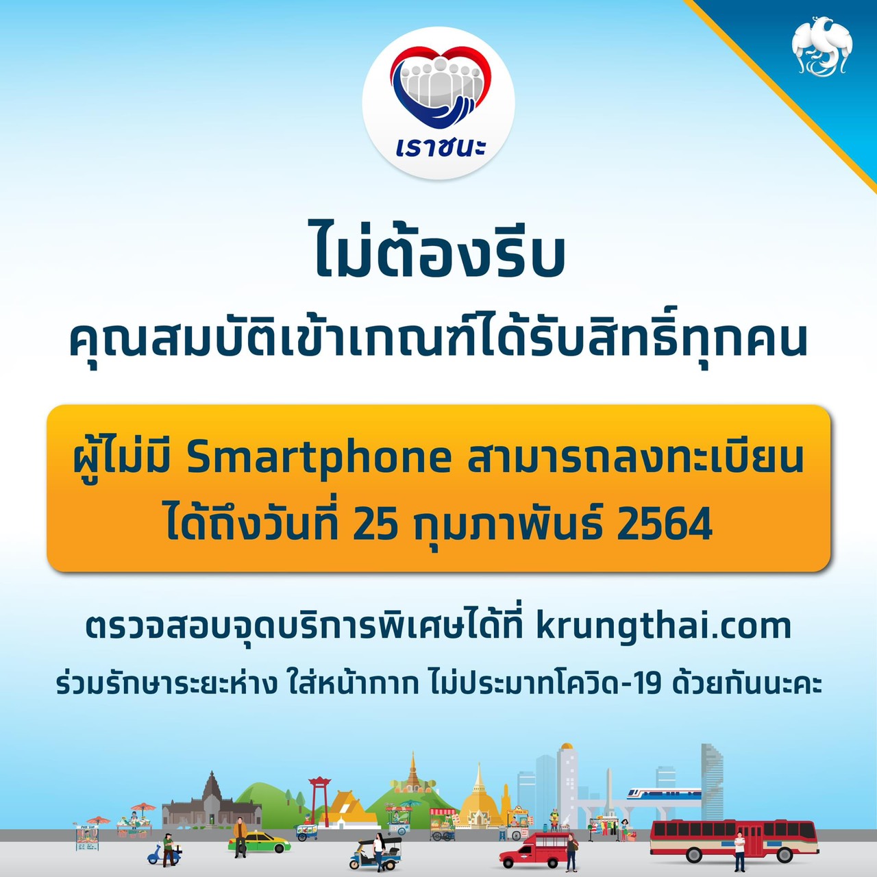 ทั้งนี้ ธนาคารได้เพิ่มจุดลงทะเบียนพิเศษเพื่อช่วยเหลือบริการ ให้กับผู้ที่ไม่สามารถลงทะเบียนได้อีกด้วย โดยสามารถตรวจสอบจุดลงทะเบียนทั้งหมดได้ที่ https://krungthai.com/th/krungthai-update/promotion-detail/609