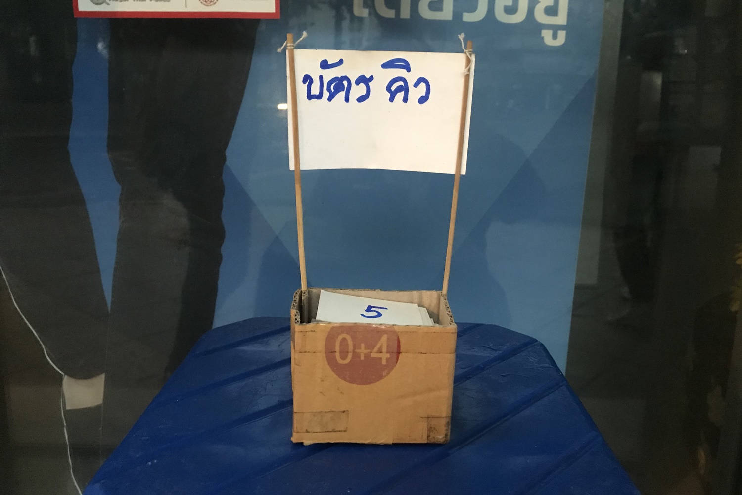 ดังนั้น ประชาชนคนดังกล่าวจึงทำบัตรคิวมาตั้งไว้ที่หน้าสาขาธนาคารกรุงไทยแต่เช้ามืดเพื่อให้คนที่มาแต่เช้ามืดได้หยิบบัตรคิวดังกล่าว และมีเวลาไปกินข้าวเช้ารอธนาคารเปิดทำการเวลา 8.30 น. ไม่ต้องมายืนรอหน้าธนาคารกันเป็นเวลานานเกิดความแออัดเหมือนวันแรกที่ผ่านมา โดยบัตรคิวในกล่องน้อยนี้มีประมาณ 100 บัตรคิว ซึ่งเป็นจำนวนที่คาดว่าธนาคารกรุงไทยสาขานี้จะรับลงทะเบียนเราชนะได้ในแต่ละวัน